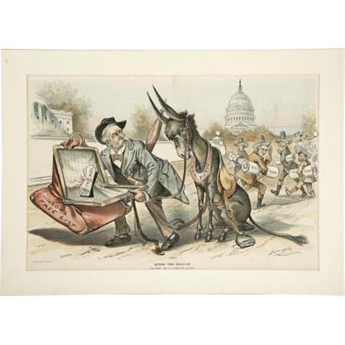 <B>Full Color Political Cartoon "After the Hold-Up" by Louis Darymple, New York, </B></I><B><I>Puck</B></I></B></I><B>, 1894.</B></I> The cartoon features United States senators Calvin Brice (1890-1896) of Ohio, Charles Faulkner (1887-1899) of West Virginia, Arthur Gorman (1881-1899 & 1903-1906) of Maryland, and John McPherson (1877 - 1895) of New Jersey. It measures 18.5" x 12" (21.25" x 15.25" including the mat). Wear on a center fold, else fine.<BR><BR>The <B>Wilson-Gorman Tariff</B></I> of 1894 slightly reduced the United States tariff rates from the numbers set in the 1890 McKinley tariff. It is named for Congressman William L. Wilson Representative from West Virginia, chair of the U.S. House Ways and Means Committee, and Senator Arthur P. Gorman of Maryland. <BR>Supported by the Democrats, this attempt at tariff reform was important because it imposed an income tax of two percent to make up for revenue that would be lost by tariff reductions. The bill introduced by Wilson and passed by the House would have made significant reforms. However, by the time the bill passed the Senate, it had more than 600 amendments attached that nullified most of the reforms. The "Sugar Trust" in particular made changes that favored it at the expense of the consumer.<BR><BR>President Grover Cleveland, who campaigned on tariff reform and supported Wilson's version of the bill, was devastated that his program had been ruined. He denounced the revised measure as a disgraceful product of "party perfidy and party dishonor," but still allowed it to become law without his signature, believing that it was better than nothing and was at the least an improvement over the McKinley tariff.<BR><BR><b>Shipping:</b> Flat Material, Large (<a target="_blank" href="http://www.heritageauctions.com/common/shipping.php">view shipping information</a>)