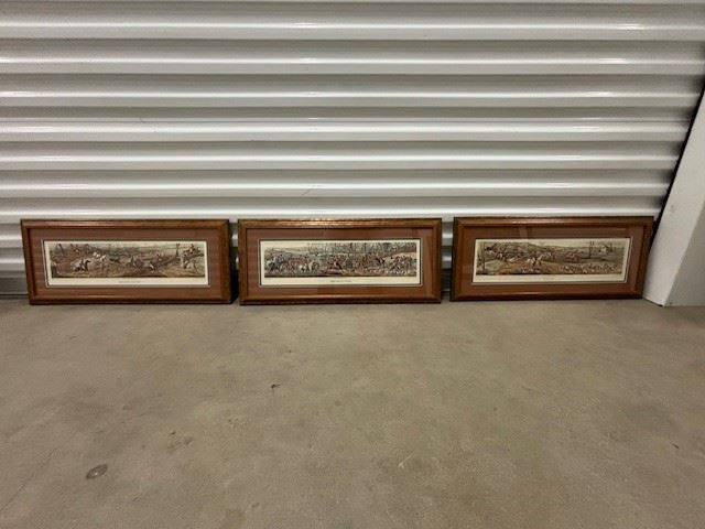 One of 3 matching tastefully framed classsic FoxHunting lithos published in London in the style of Currier & Ives. Each framed piece measures26.25" x10.5"