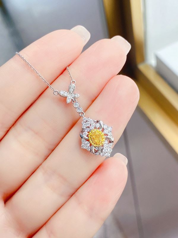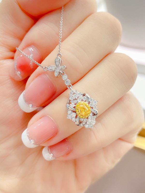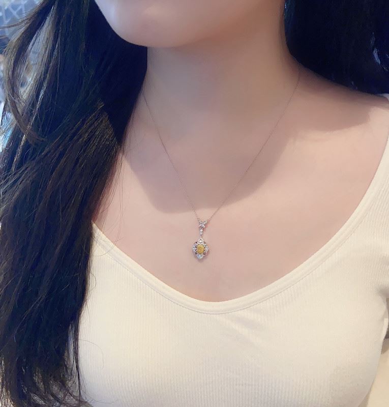 This full diamond yellow diamond necklace features a dazzling yellow diamond at the center, surrounded by exquisite white diamonds, designed to resemble a blooming flower. The small butterfly and delicate diamond arrangement above add a touch of romance and sophistication, perfectly blending luxury and elegance. Main diamond: 0.25 ct, side diamonds: 0.450 ct. Note: Comes with an AGL certificate and a domestic jewelry identification certificate.