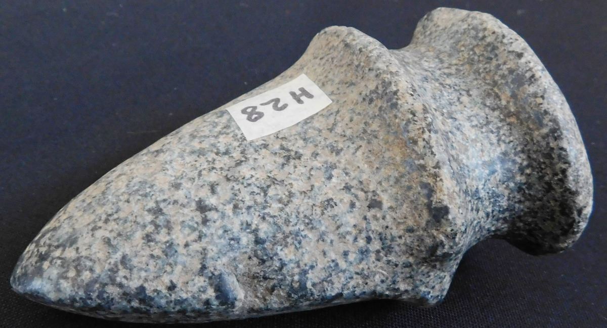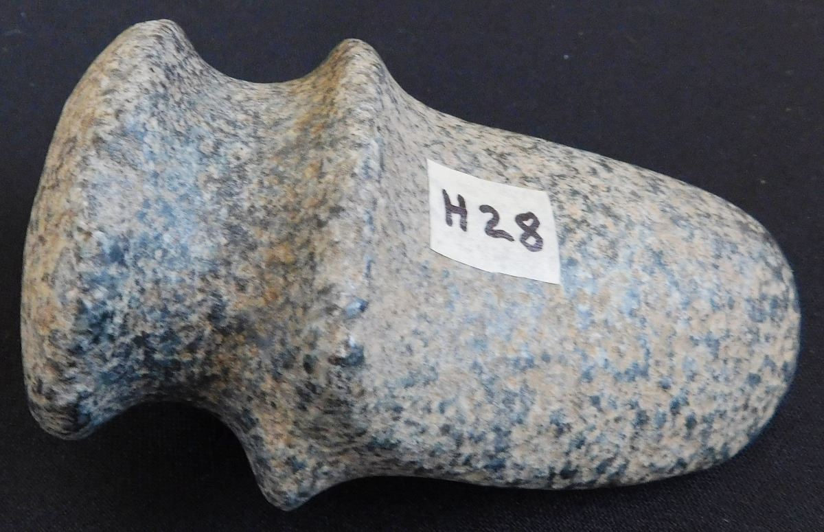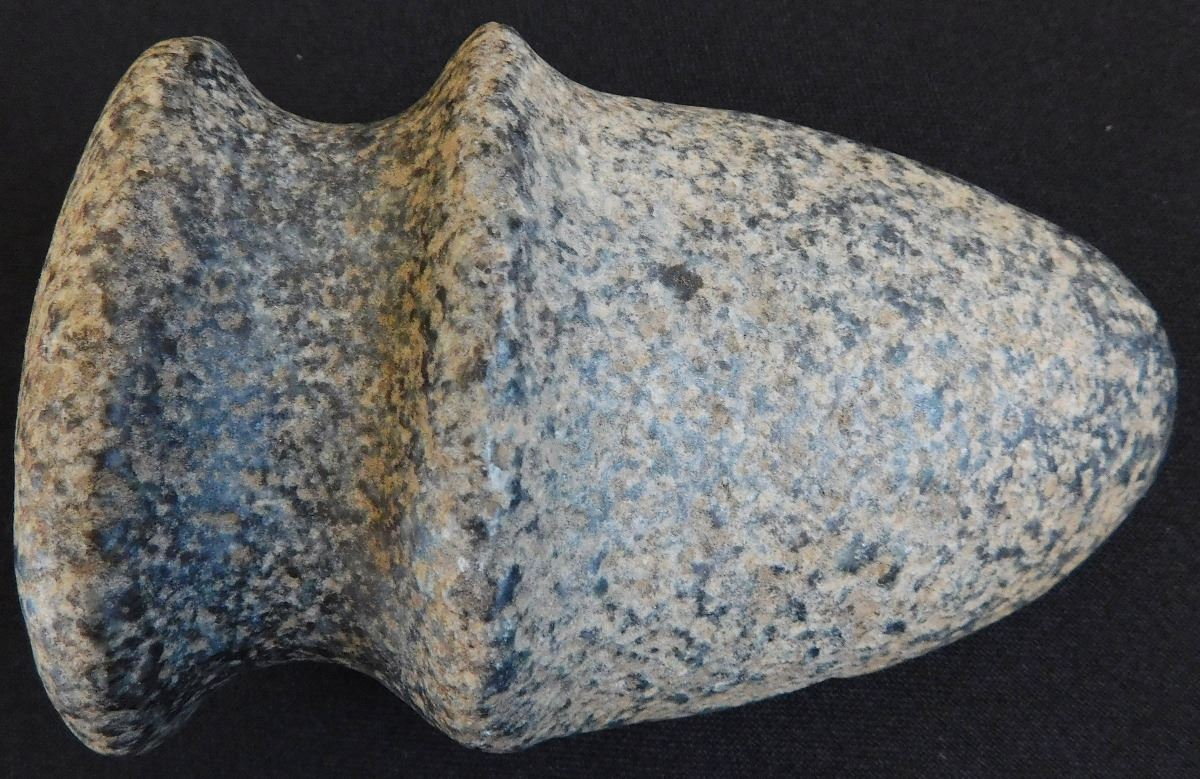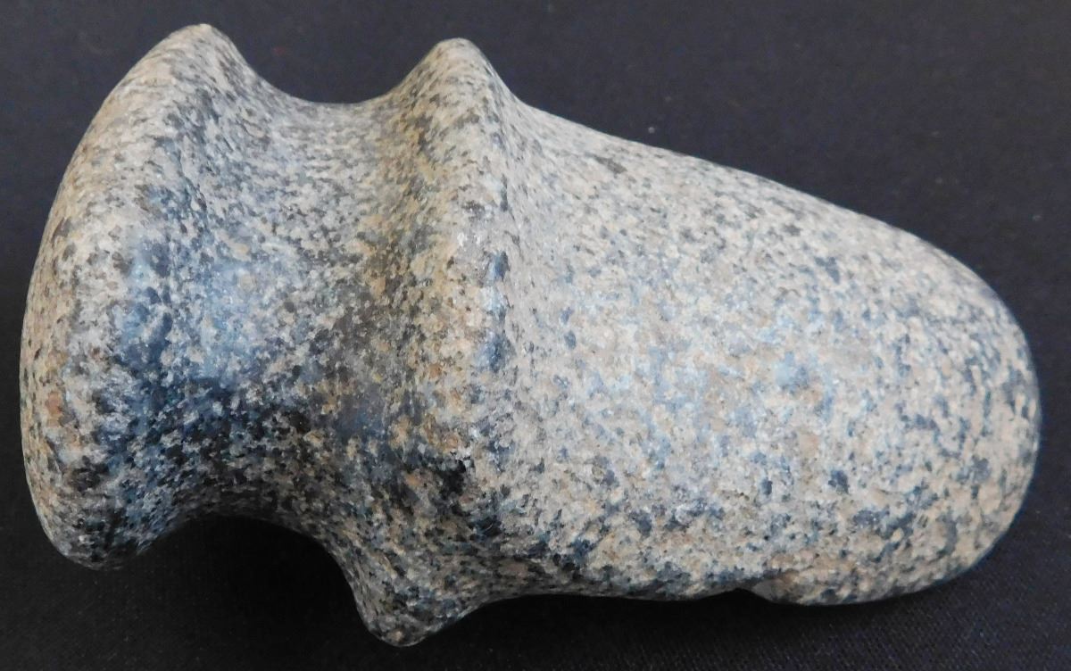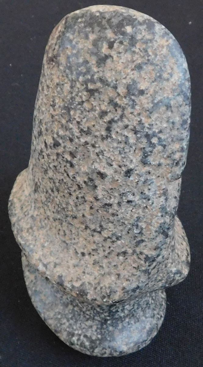 Full Groove Stone Axe, c. 2000 years old. Made of granite, this item measures 5 x 3x 2.5 inches. This could be a trophy axe as it has a twisted bit. Condition: There are minor nicks on this axe, see images. Shipping: $22.00.