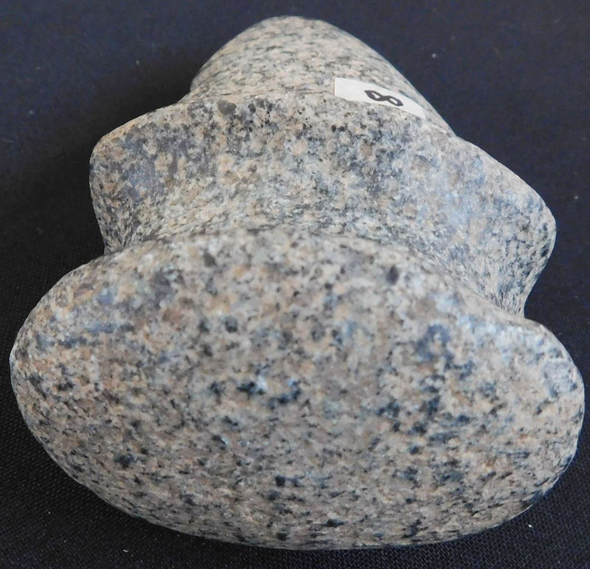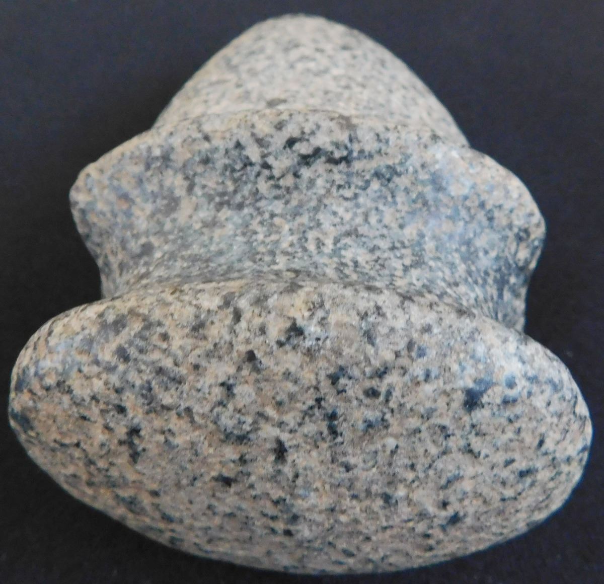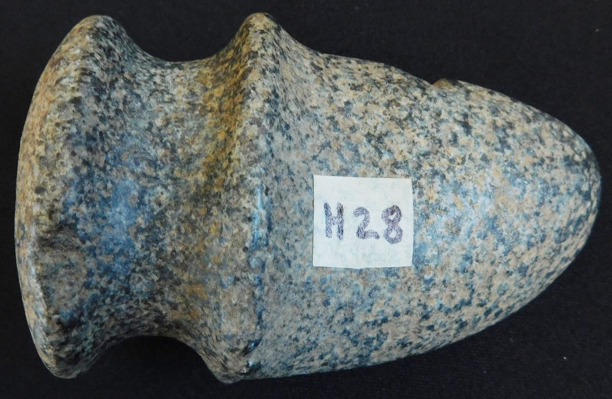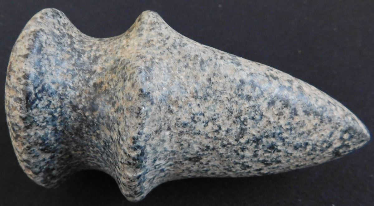 Full Groove Stone Axe, c. 2000 years old. Made of granite, this item measures 5 x 3x 2.5 inches. This could be a trophy axe as it has a twisted bit. Condition: There are minor nicks on this axe, see images. Shipping: $22.00.