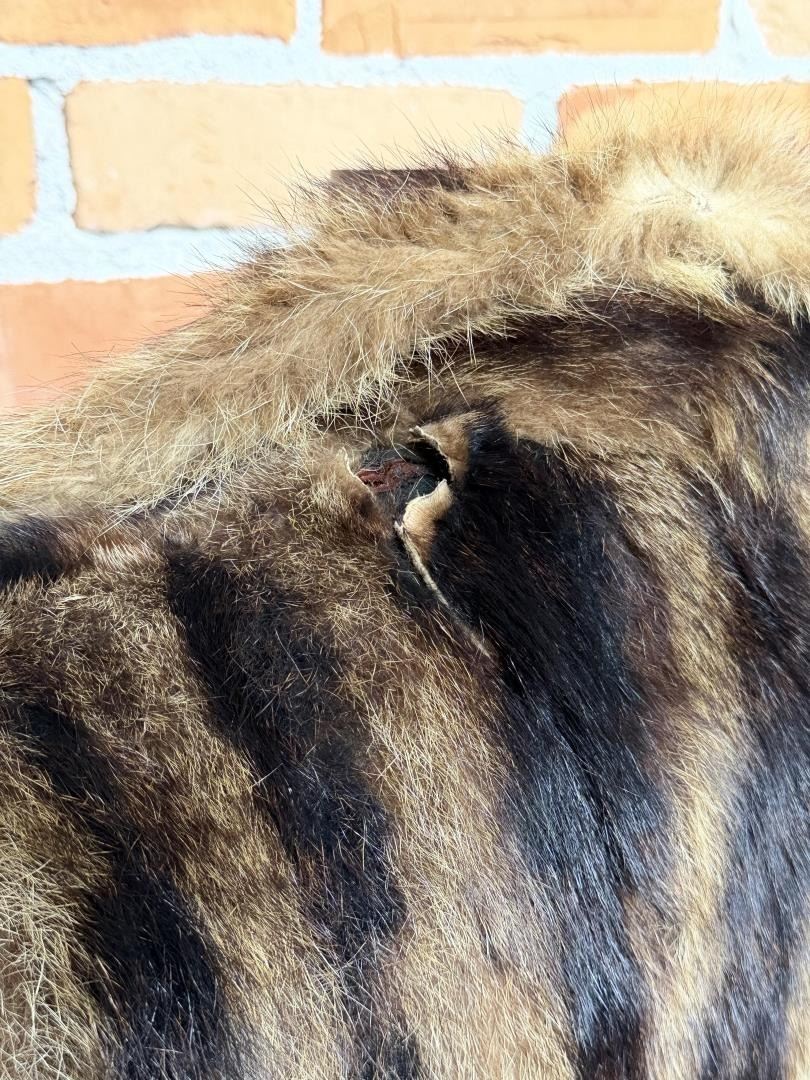 Tear in shoulder as shown. 16" shoulder to shoulder, 18" pit to pit, and 48" long.