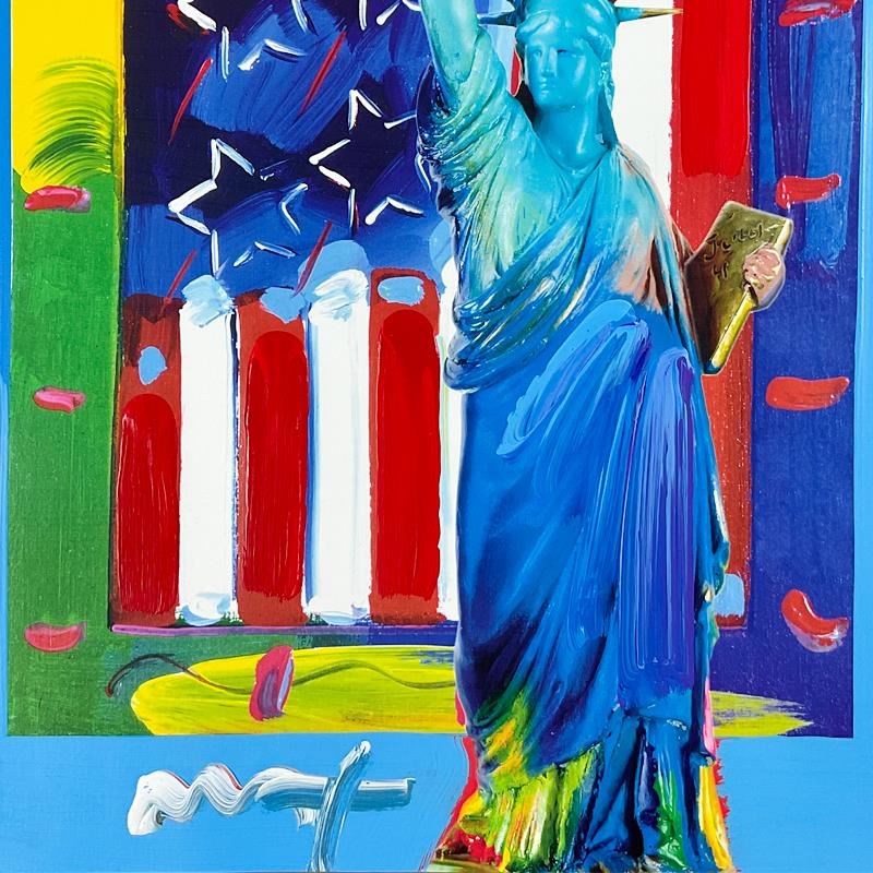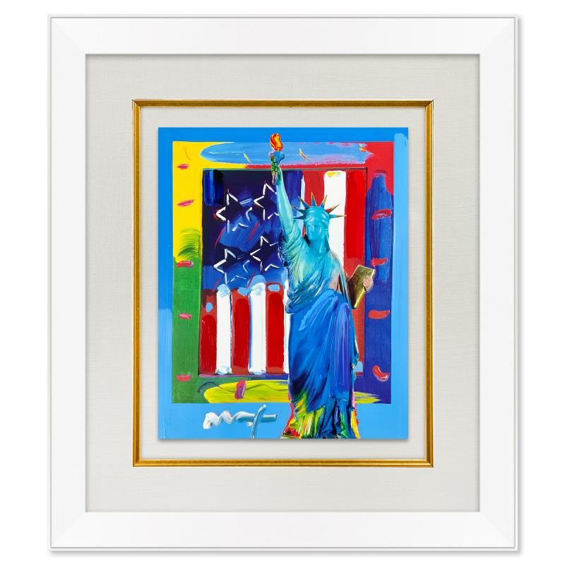 "Full Liberty with Flag" is a one-of-a-kind acrylic mixed media on paper, hand signed by Peter Max. On the reverse side of this piece there is a registration number from Peter Max Studios certifying authenticity. This piece comes custom framed. Measures approx. 28" x 24" (frame), 19" x 15" (image).