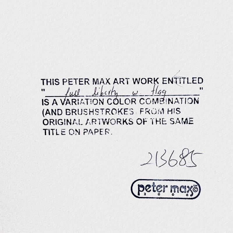 "Full Liberty with Flag" is a one-of-a-kind mixed media on paper, hand signed by Peter Max. The piece comes custom framed with a backside cutout to display Peter Max Studio registration number 213685 certifying authenticity. Measures approximately 28" x 24" (frame), 19" x 15" (image). This item requires special handling and may have a longer than usual turnaround.
