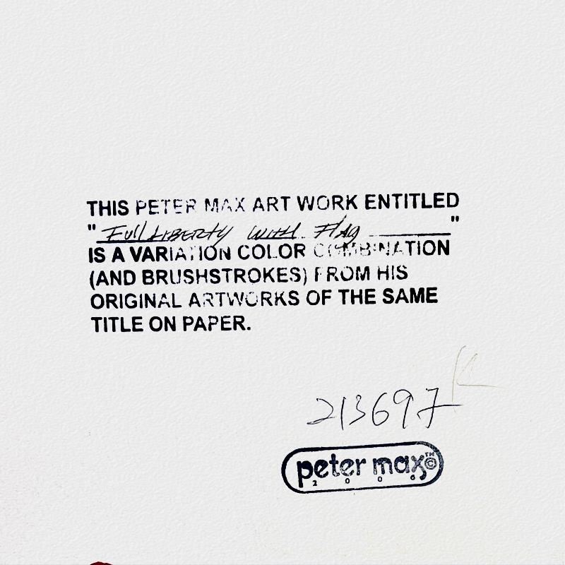 "Full Liberty with Flag" is a one-of-a-kind mixed media on paper, hand signed by Peter Max. The piece comes custom framed with a backside cutout to display Peter Max Studio registration number 213697 certifying authenticity. Measures approximately 28" x 24" (frame), 19" x 15" (image). This item requires special handling and may have a longer than usual turnaround.