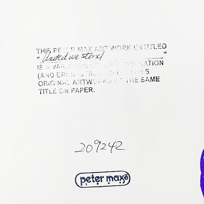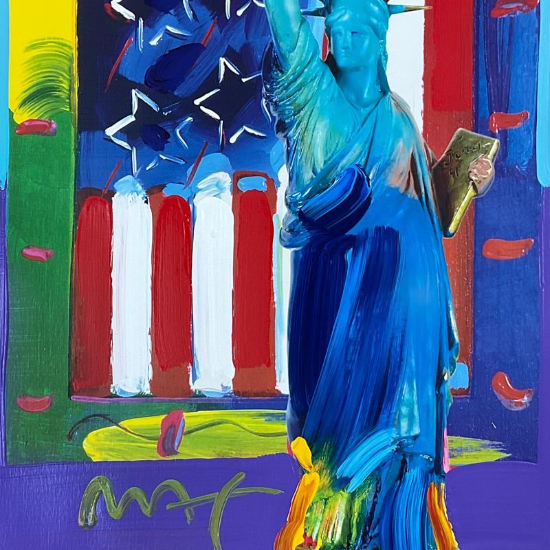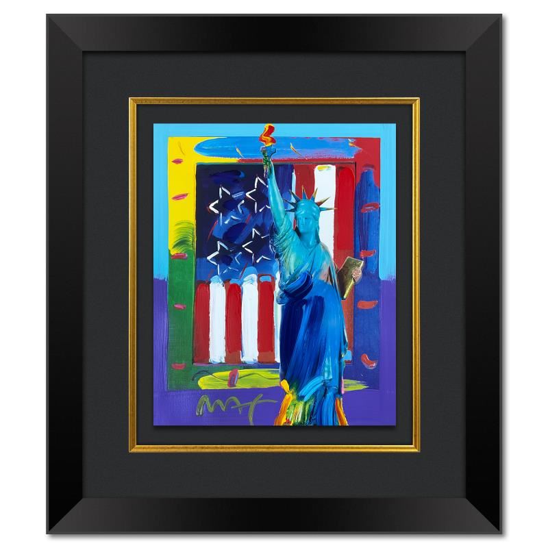 "Full Liberty with Flag" is a one-of-a-kind acrylic mixed media on paper, hand signed by Peter Max. The piece comes custom framed with a backside cutout to display Peter Max Studio registration number 209242 certifying authenticity. Measures approx. 28" x 24" (frame), 19" x 15" (image). This item requires special handling and may have a longer than usual turnaround.