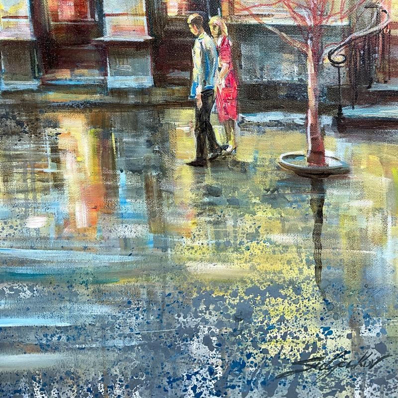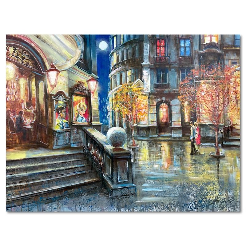 "Full Moon Promenade" is an original oil painting on stretched canvas by Vadik Suljakov, hand signed by the artist. Includes Letter of Authenticity. Measures approx. 40" x 30" (image).