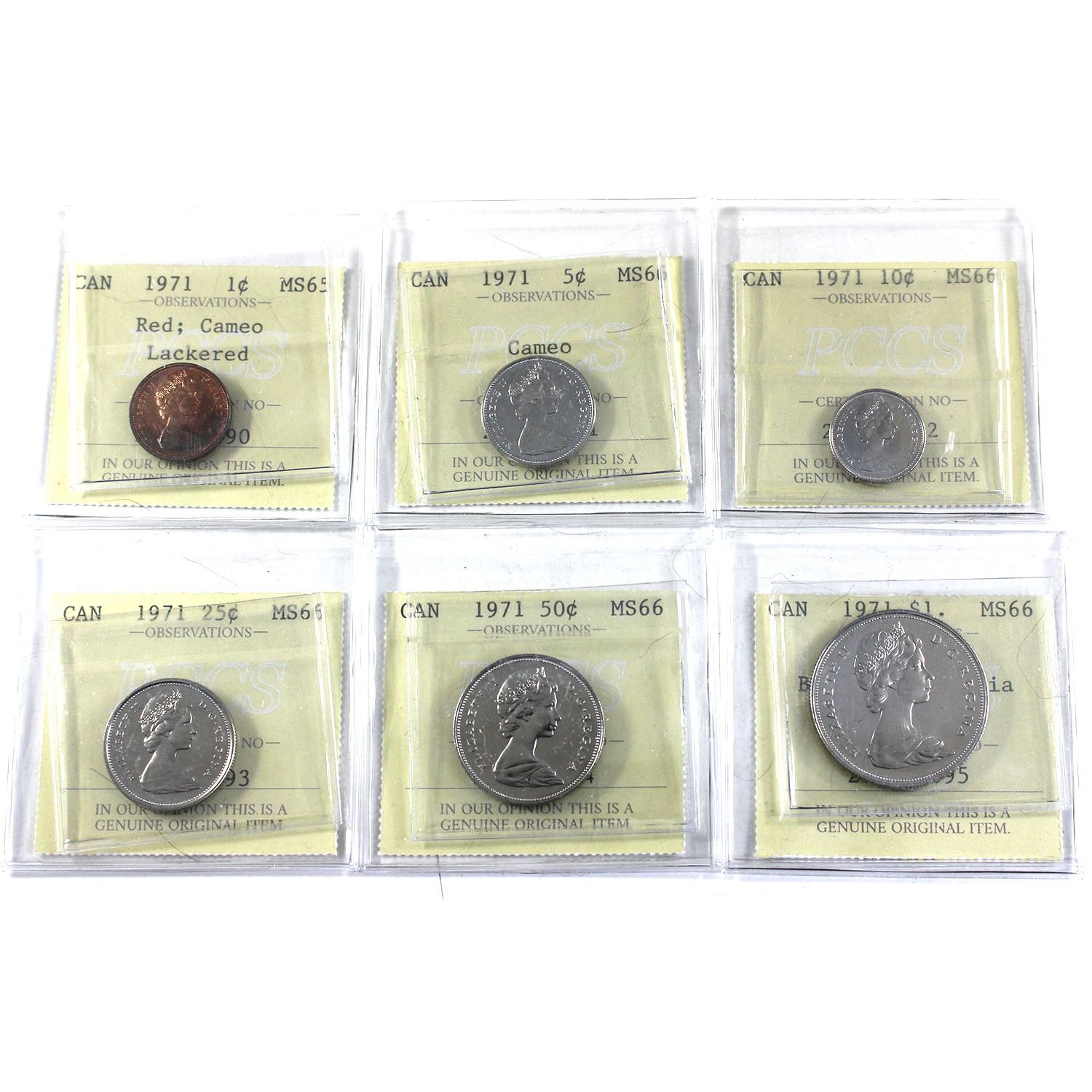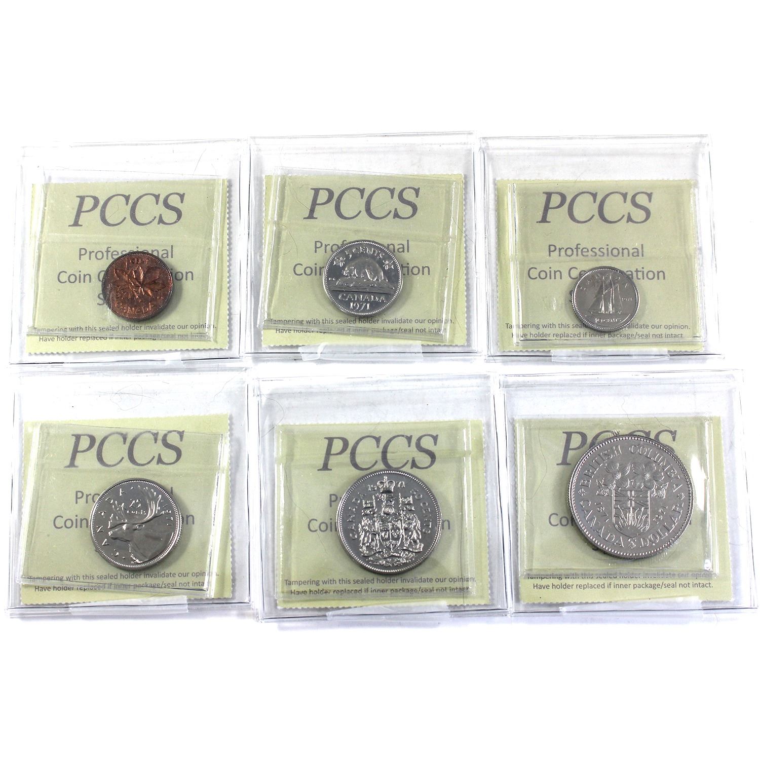Full Run 1971 PCCS (Professional Coin Certification System) MS65 to MS66. INCLUDES: 1-cent MS65 Red Cameo Lackered, 5-cent MS66 Cameo, 10-cent MS66, 25-cent MS66, 50-cent MS66, & Nickel $1 British Columbia MS66. Holders may be lightly scratched. 6pcs.