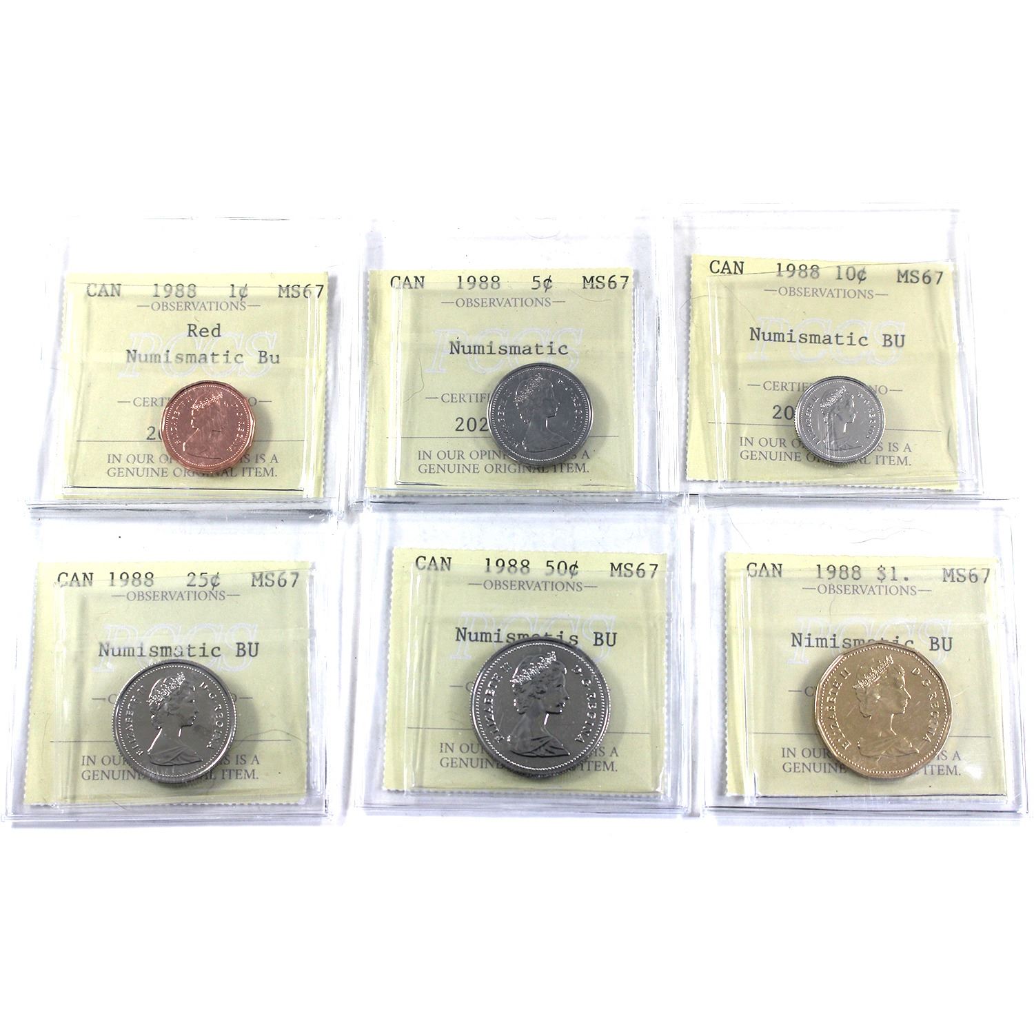 Full Run 1988 PCCS (Professional Coin Certification System) MS67 NBU. INCLUDES: 1-cent Red, 5-cent, 10-cent, 25-cent, 50-cent, & Loon $1. Holders may be lightly scratched. 6pcs.