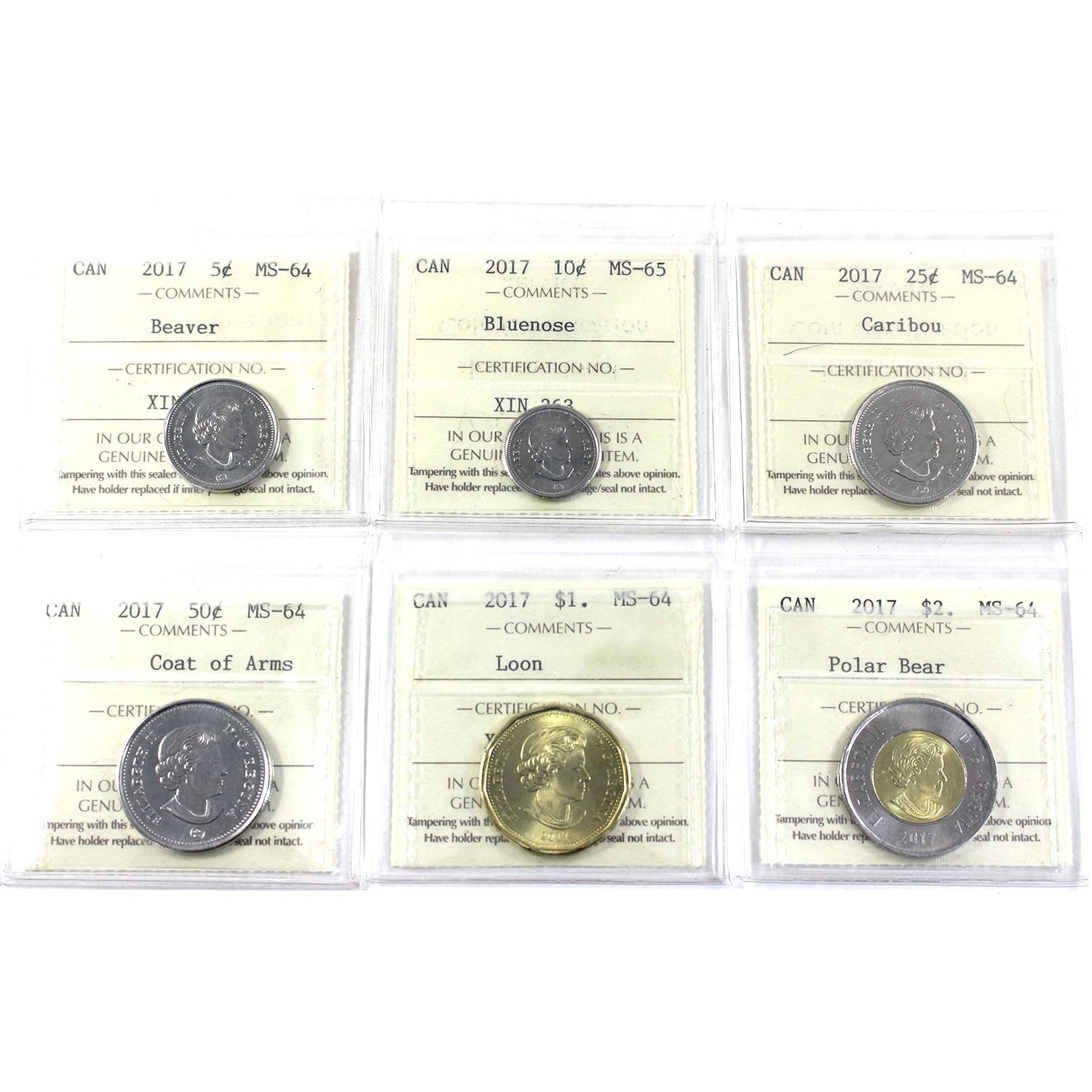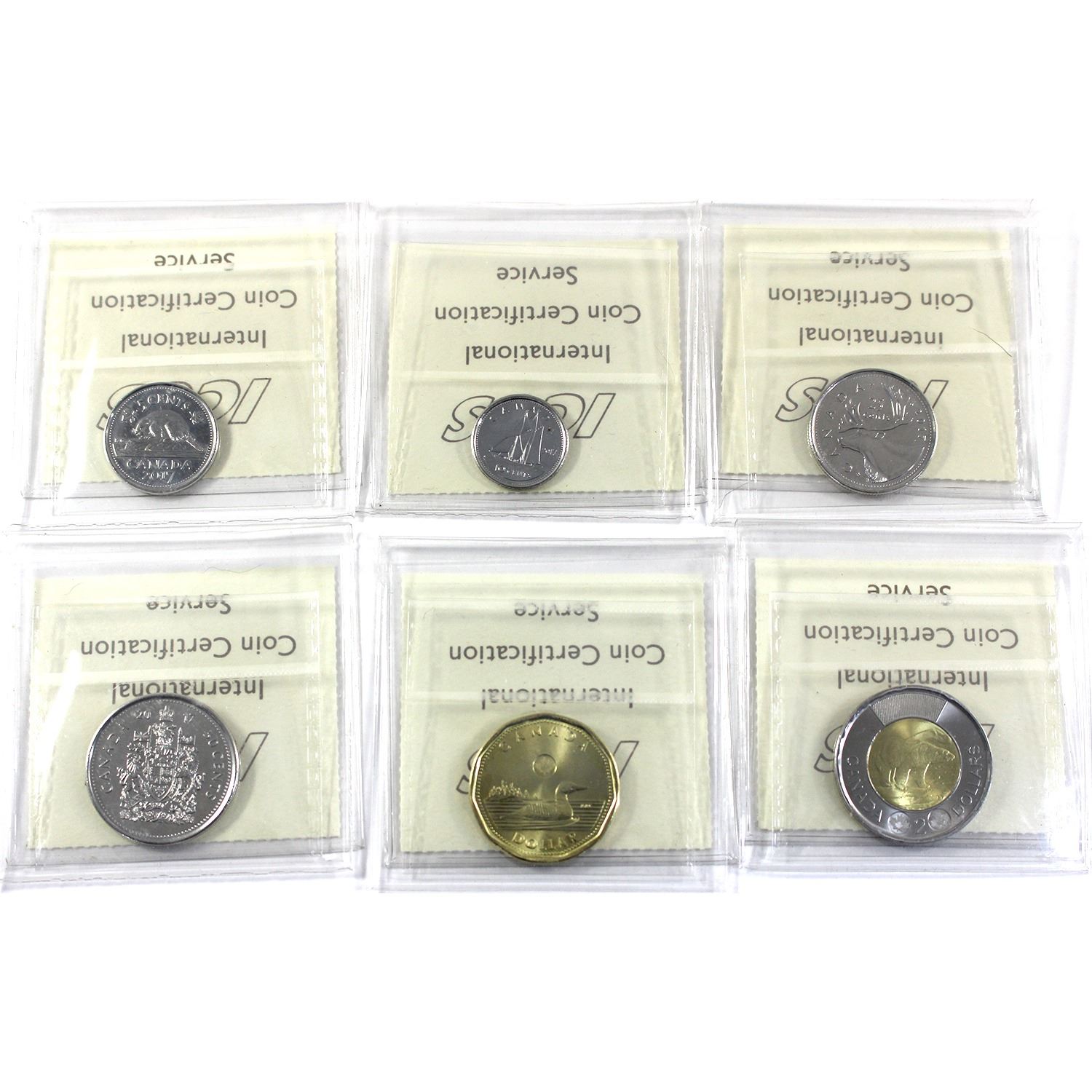 Full Run 2017 ICCS MS64 to MS65. INCLUDES: 5-cent MS64, 10-cent MS65, 25-cent MS64, 50-cent MS64, Loon $1 MS64, & $2 MS64. 6pcs.