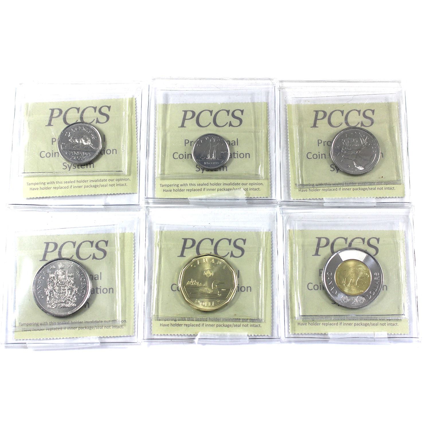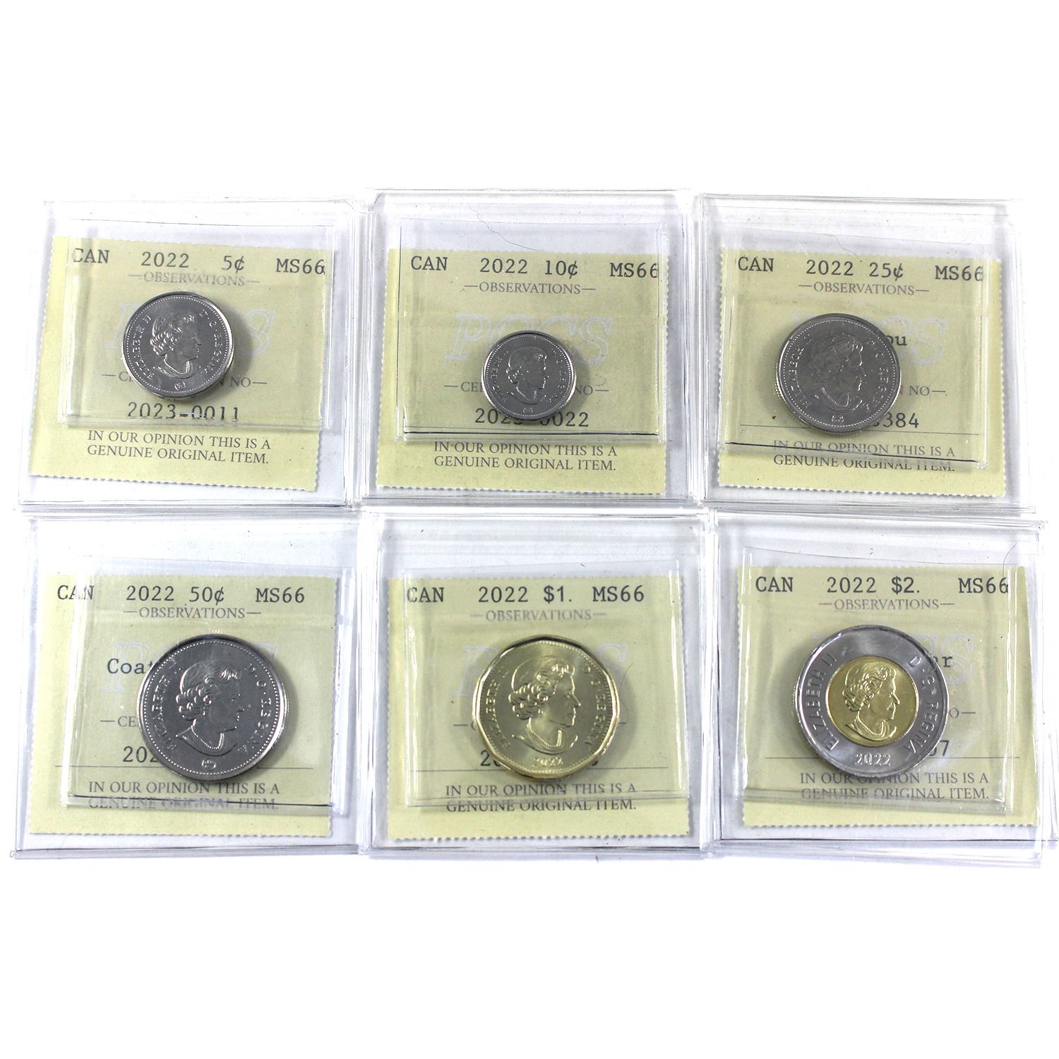 Full Run 2022 PCCS (Professional Coin Certification System) MS66. INCLUDES: 5-cent, 10-cent, 25-cent, 50-cent, Loon $1, & $2. Holders may be lightly scratched. 6pcs.