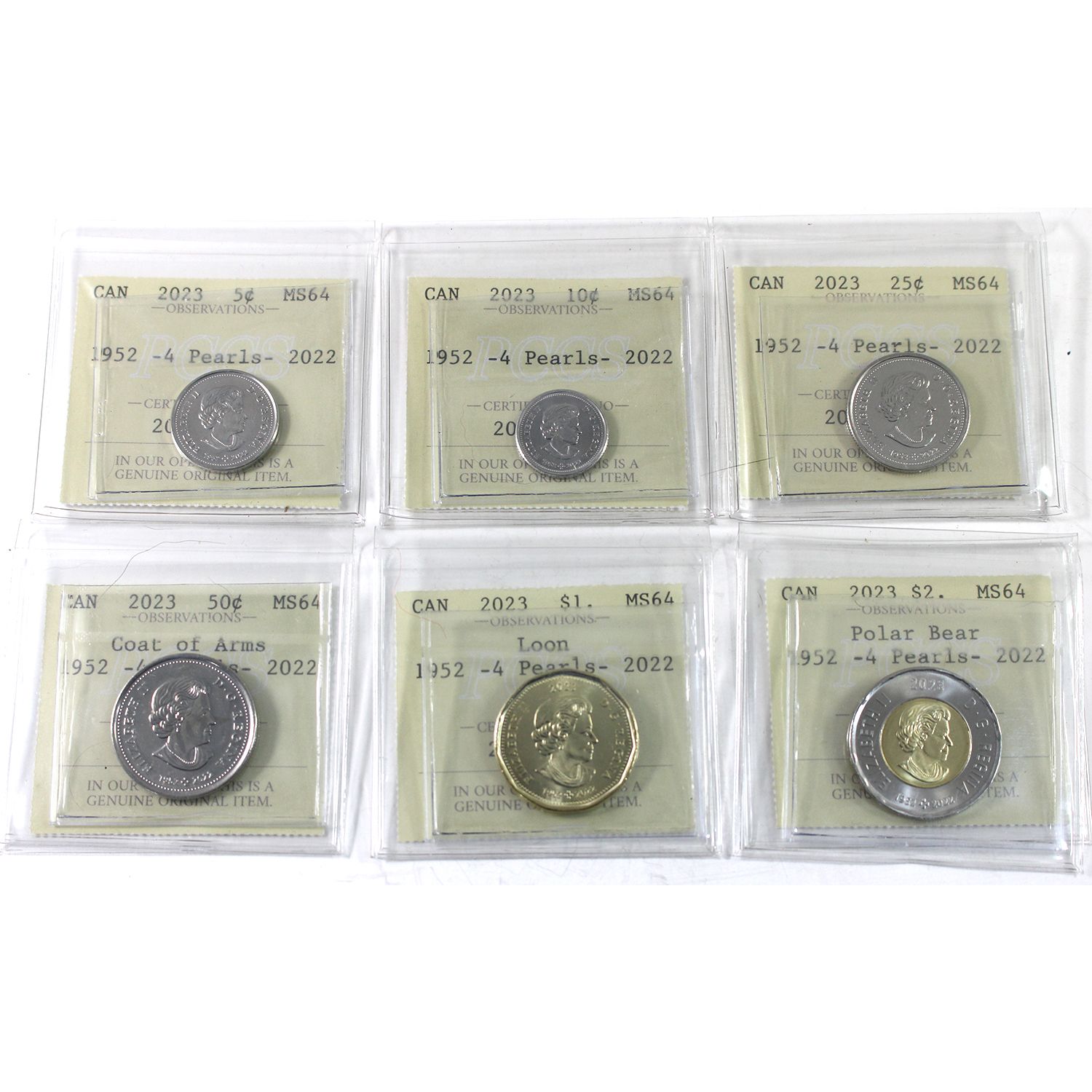 INCLUDES: 5-cent, 10-cent, 25-cent Caribou & 50-cent Coat of Arms, Loon $1 & $2. 6pcs.