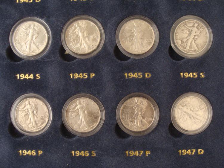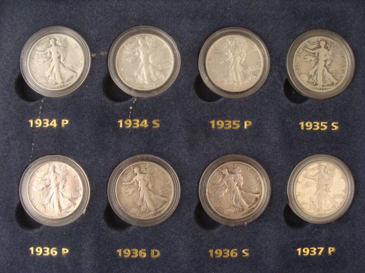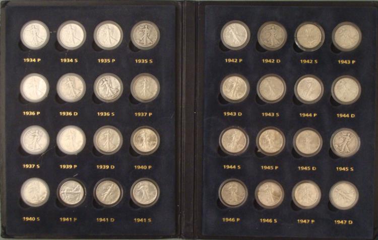 This is a very nice short set of Walking Liberty Halves from 1934-1947 (complete). * There are a total of 32 coins. At least a dozen are Almost Uncirculated to Uncirculated, with the rest grading Very Fine or better. It's a great set, all individually encased, with years and velvet interior in book.