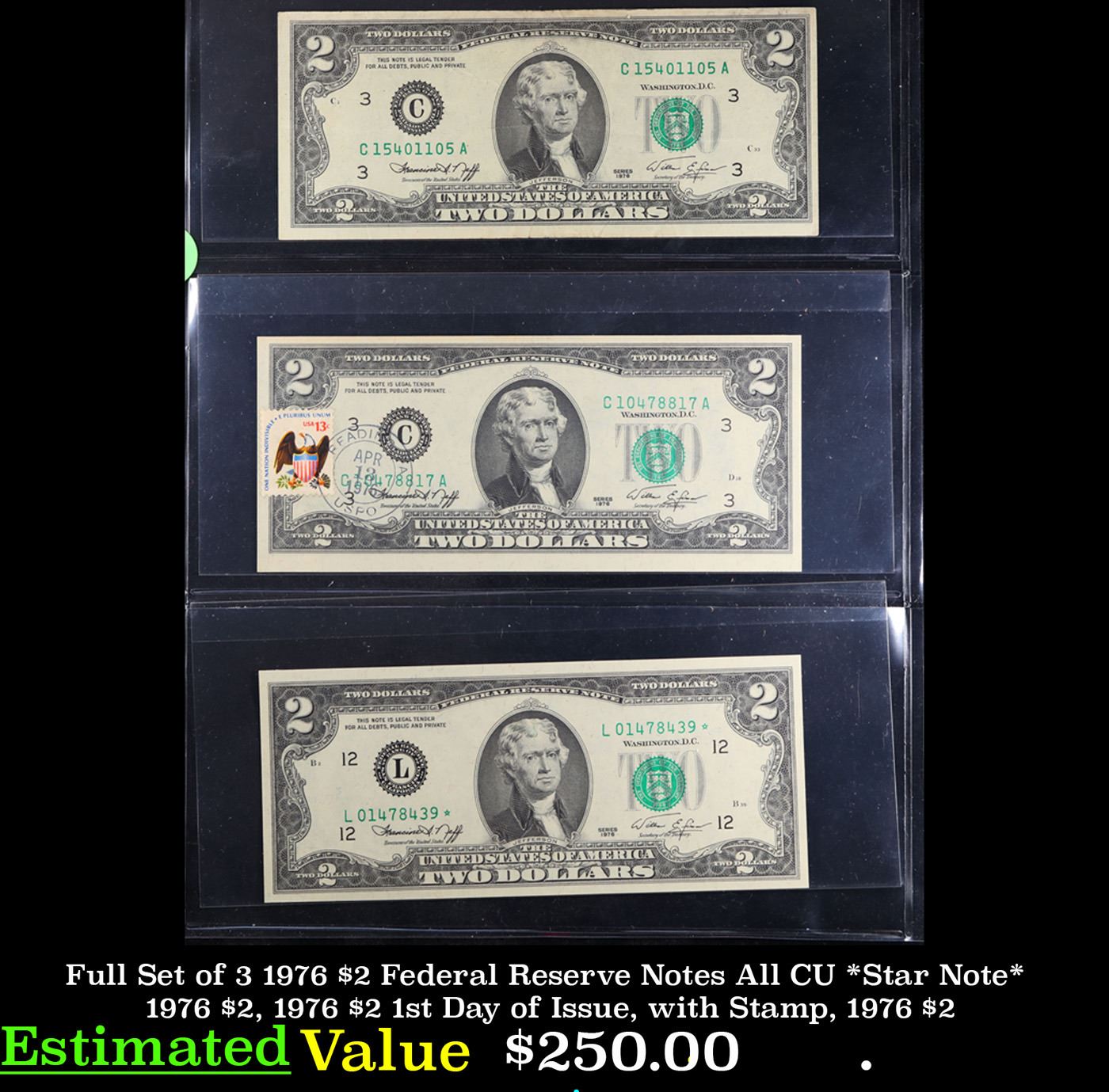 Full Set of 3 1976 $2 Federal Reserve Notes All CU *Star Note* 1976 $2, 1976 $2 1st Day of Issue, wi