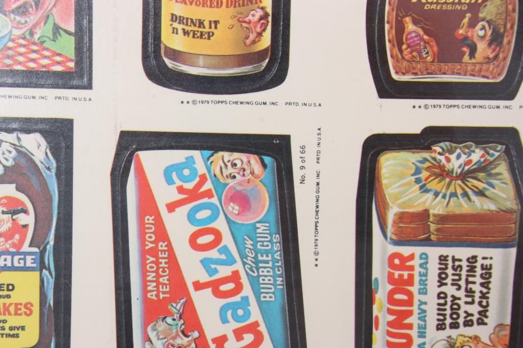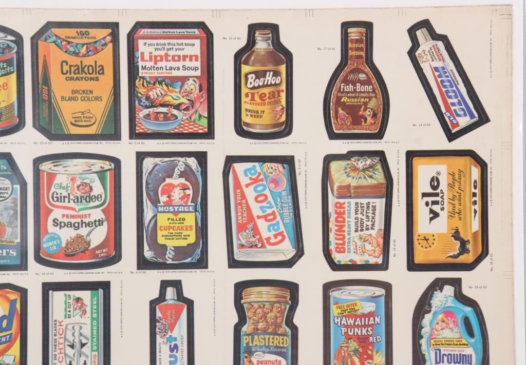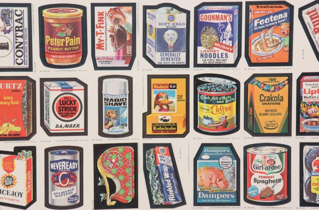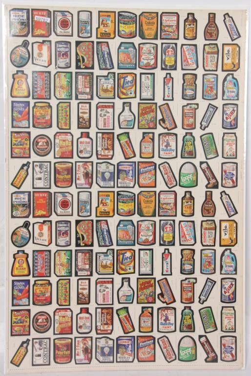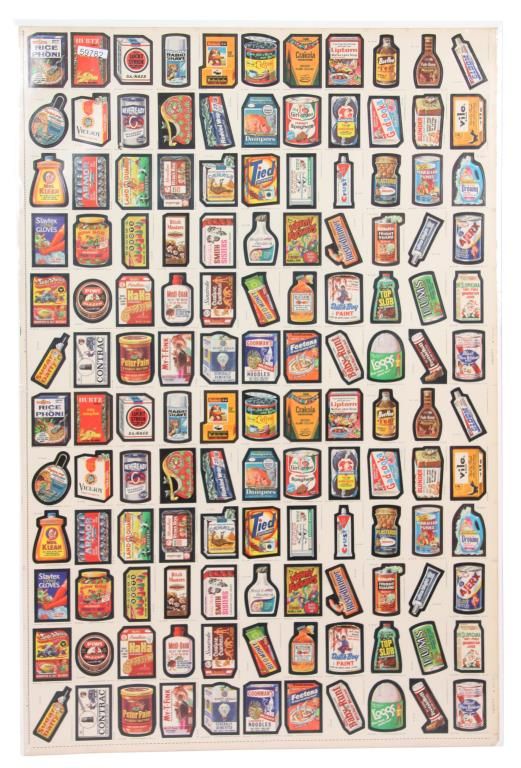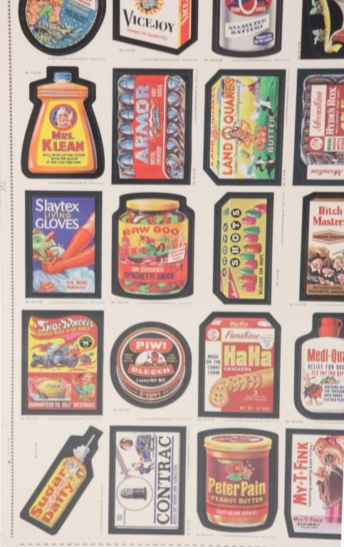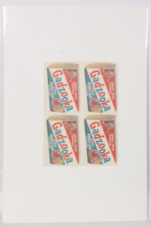 Full sheet of 132 uncut stickers, the 1979 series by Topps Chewing Gum Inc. Comical stickers emulating famous brand name product advertisements and their logos; sheet measures 43 in. high x 28.5 in. wide. Mounted on the reverse is a colored lithograph of one of the stickers Annoy Your Teacher “Gadzooka” Chew Bubble Gum In Class. 21 in. high x 15 in. wide.