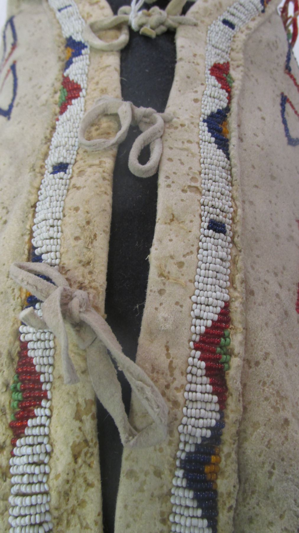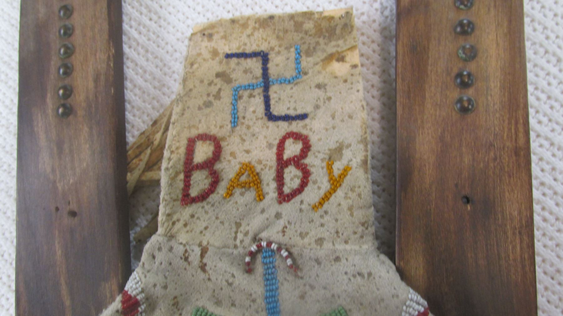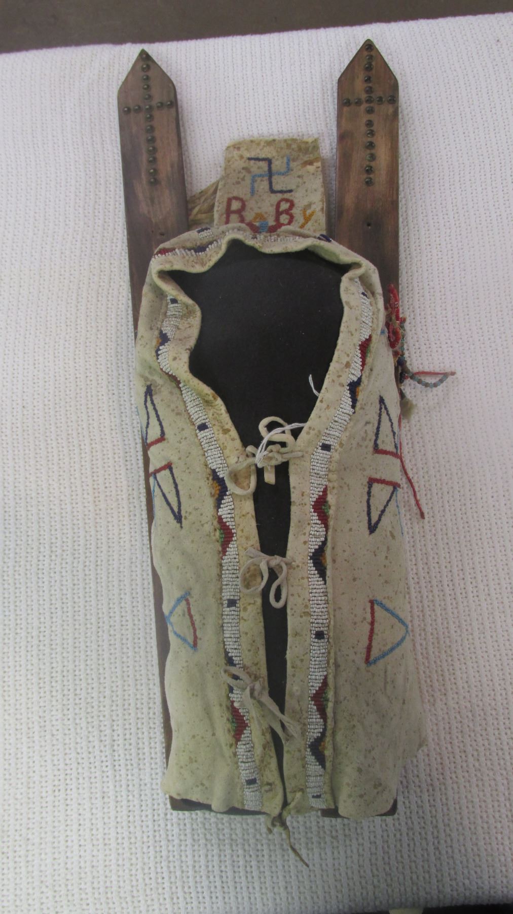 Sioux or Cheyenne Full Sized Beaded baby cradle circa 1910. Beaded on Native Tanned Buckskin with Tacked Boards. 8" wide and 18" tall not including top flap and boards.