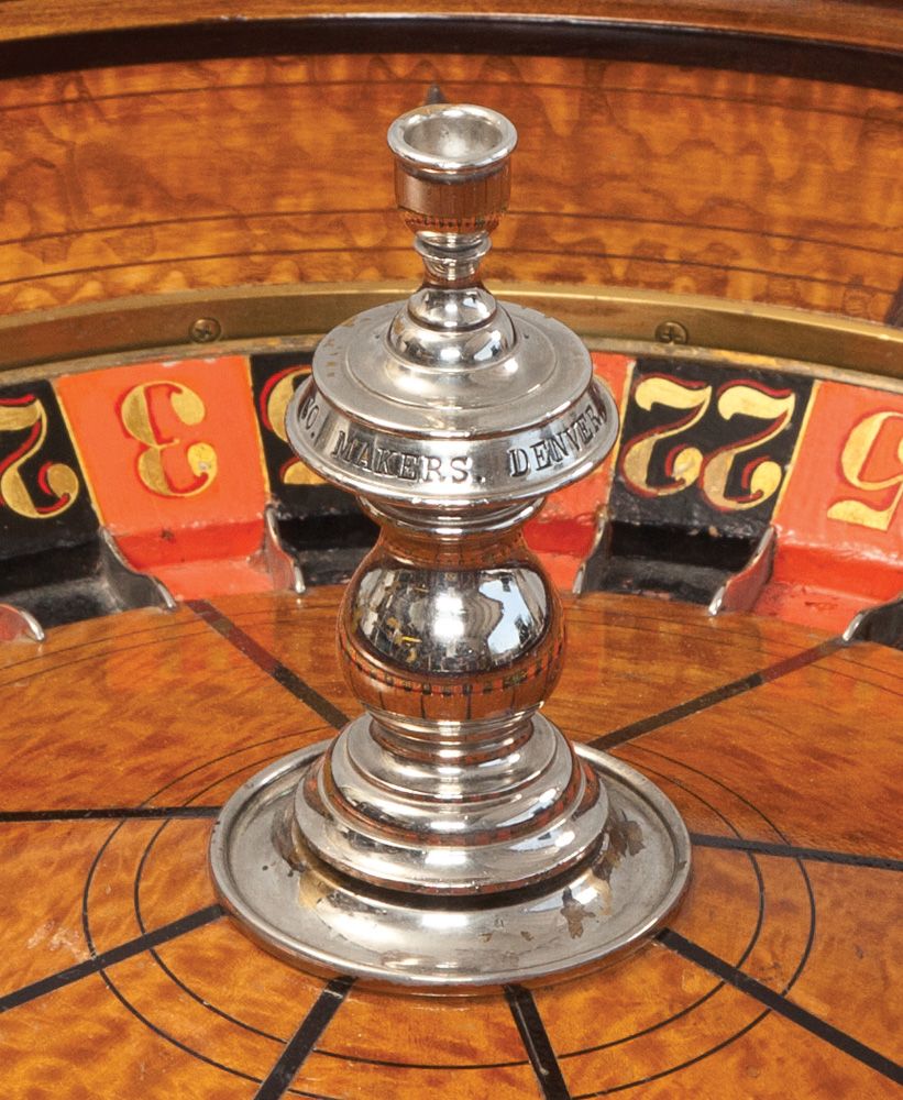 “The Geo. Mason Co. Makers. Denver. Colo. marked 32” double O wheel. This wheel was made for table top use and not to be inserted into a table. Nickel maker-marked spindle. Circa, beginning of 20th century. Condition is fine with bright colors. 90% nickel remaining, old gold repaint, some cracking to outside of case.