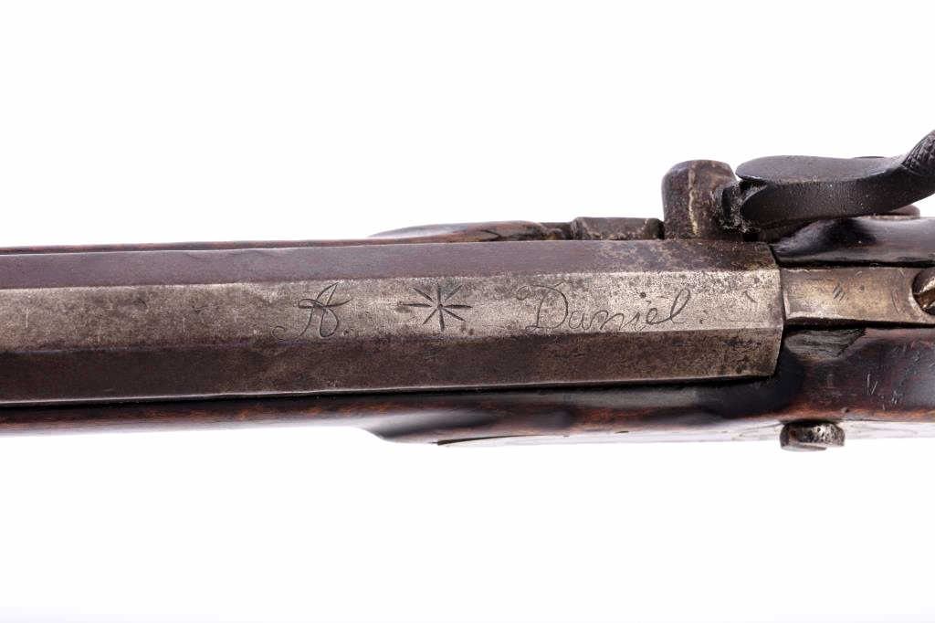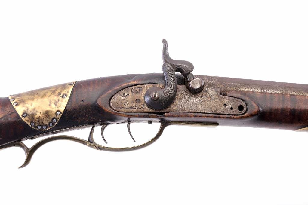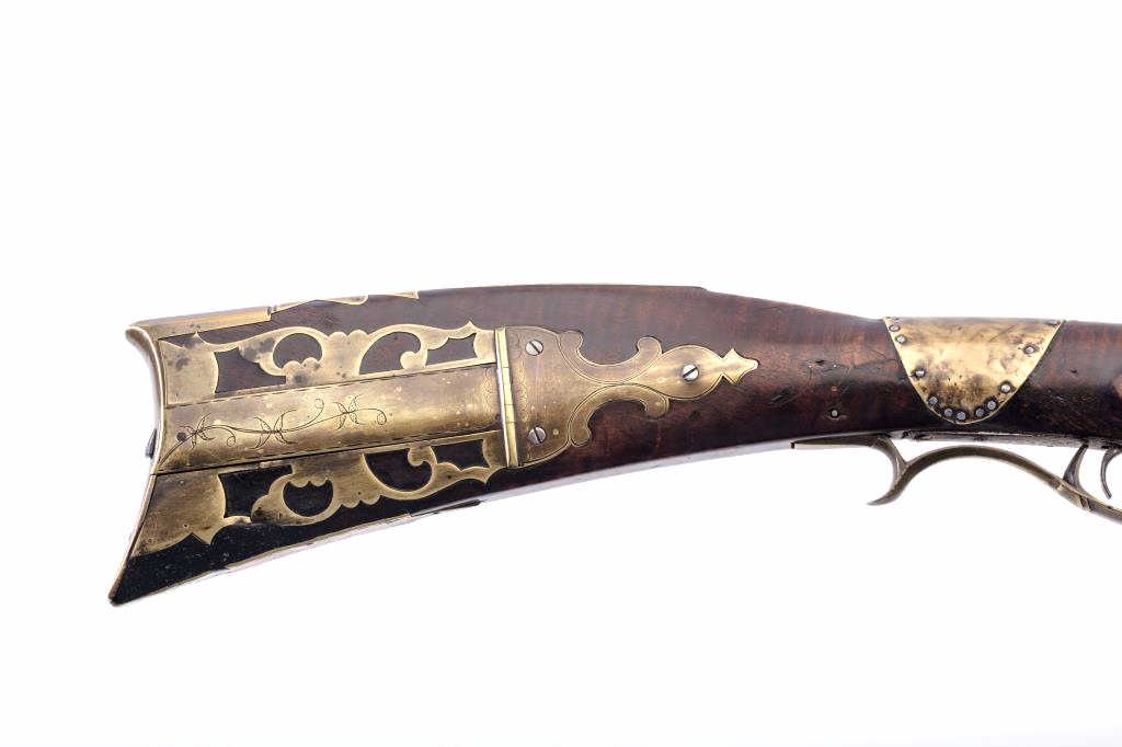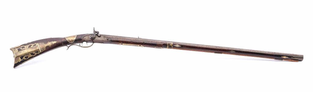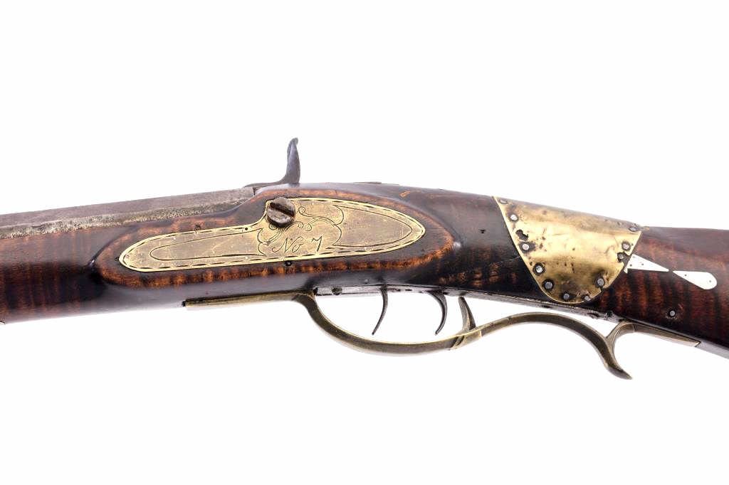 Full Stock Kentucky Rifle in percussion with barrel signed in script “A Daniel” and No. 7 engraved on sheet brass side plate. Fancy pierced patch box of generous proportions. 11 small silver inlays and showing old sheetbrass and nailed repairs. Addington Daniel is listed as a Kentucky style rifle maker in North Hampton Mass. circa 1850s to 60s. The rifle measures 52 ½” overall with 37” barrel. The lock plate was originally flint butprobably never used until percussion era. The wrist was repaired during use with sheet brass nailed around wrist and another similar repair to fore end by ramrod rear Ferrell. The lock is not holding on cocking and needsrepair. The condition is good overall with some minor erosion and pitting on the barrel. The heavier pitting in front right side of the barrel near muzzle. Large buck horn rear sight and blade front sight. In my opinionthis maker used an earlier patch box and lock to manufacture this rifle. From an old Northern California collector who purchased many arms like this directly from pioneers descendants from Mt. Shasta to Happy Camp.