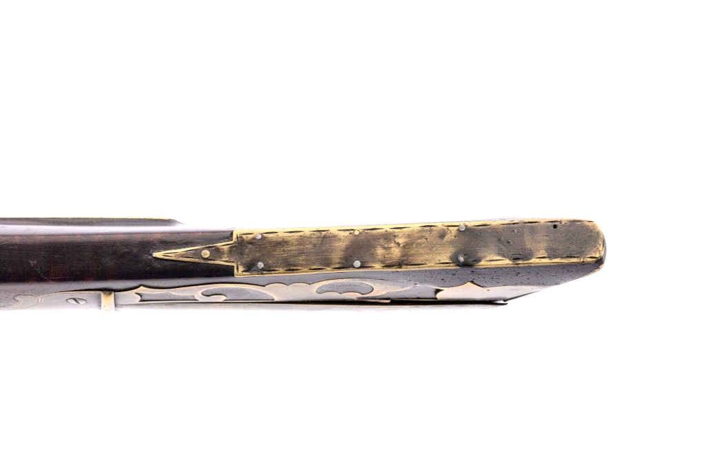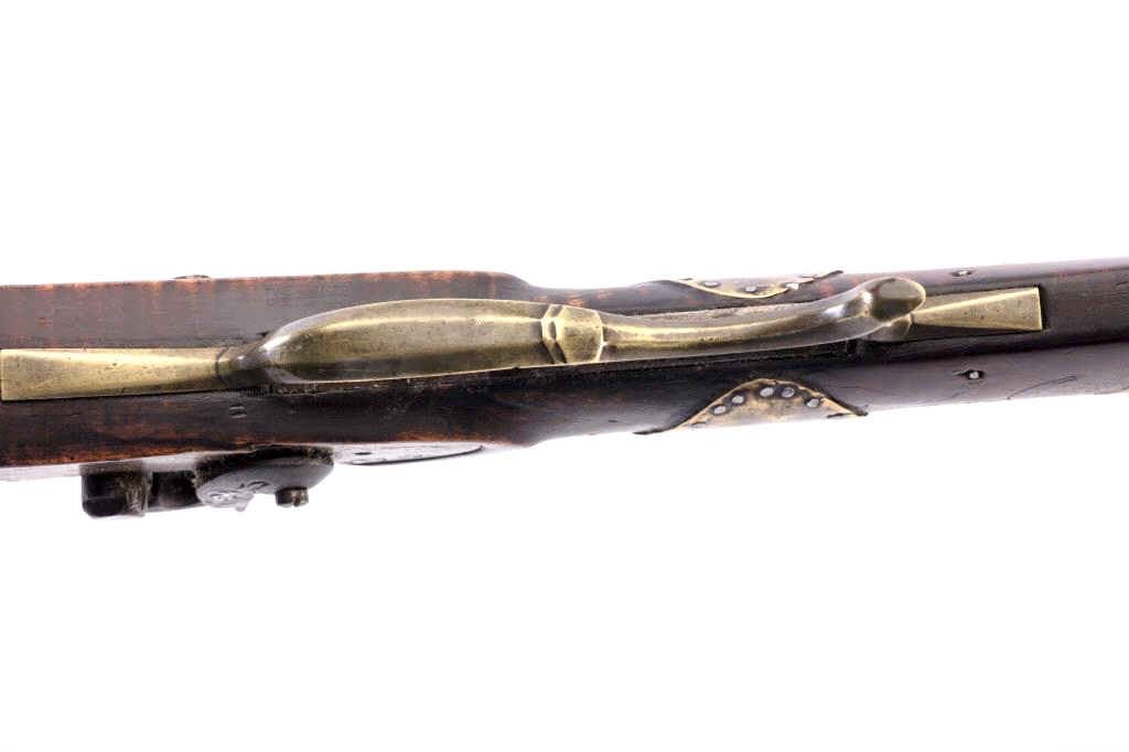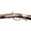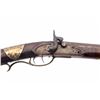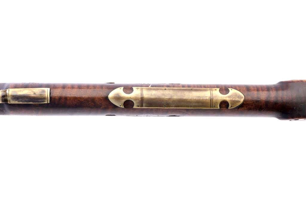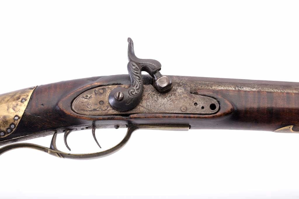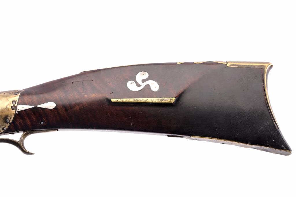 Full Stock Kentucky Rifle in percussion with barrel signed in script “A Daniel” and No. 7 engraved on sheet brass side plate. Fancy pierced patch box of generous proportions. 11 small silver inlays and showing old sheetbrass and nailed repairs. Addington Daniel is listed as a Kentucky style rifle maker in North Hampton Mass. circa 1850s to 60s. The rifle measures 52 ½” overall with 37” barrel. The lock plate was originally flint butprobably never used until percussion era. The wrist was repaired during use with sheet brass nailed around wrist and another similar repair to fore end by ramrod rear Ferrell. The lock is not holding on cocking and needsrepair. The condition is good overall with some minor erosion and pitting on the barrel. The heavier pitting in front right side of the barrel near muzzle. Large buck horn rear sight and blade front sight. In my opinionthis maker used an earlier patch box and lock to manufacture this rifle. From an old Northern California collector who purchased many arms like this directly from pioneers descendants from Mt. Shasta to Happy Camp.