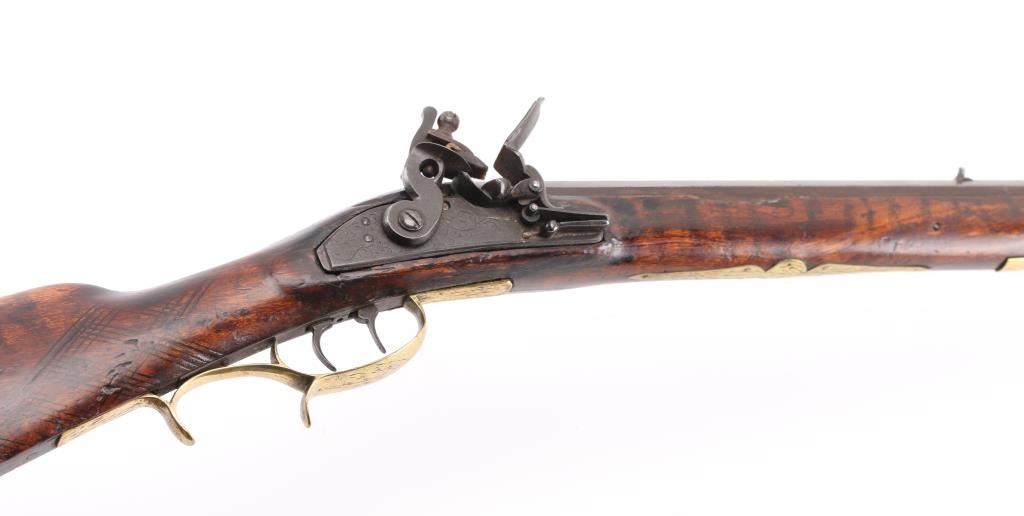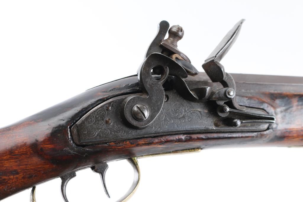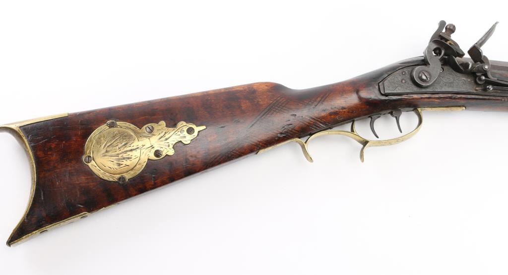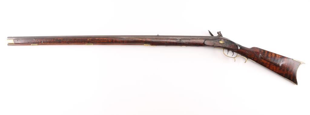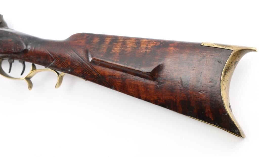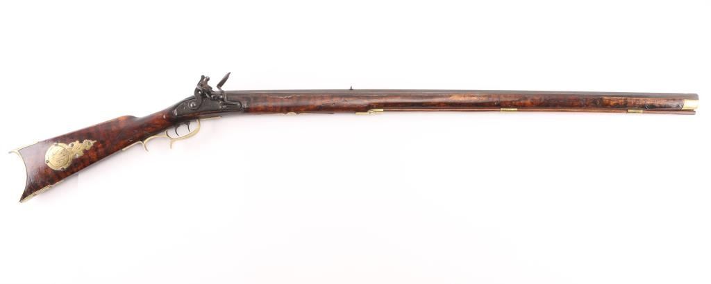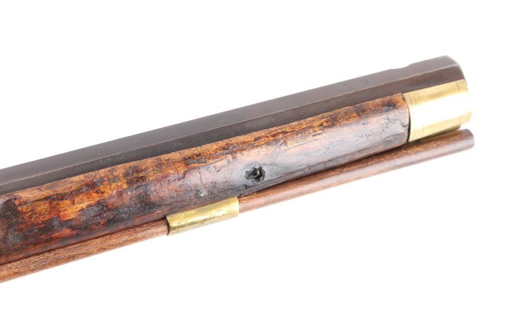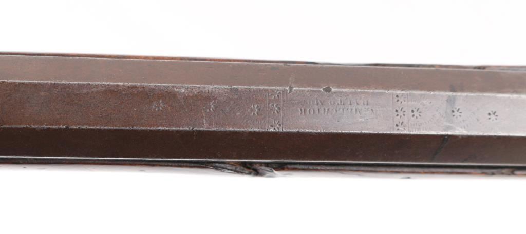 Circa 1830's. Marked "N. Melchior Balto MD", full stock 36" octagonal bull barrel in .36 Cal with missing front sight and broken rear sight. 52" overall. Roller and water proof pan. Brass disc style patch box and light checkered wrist. Dark patina with stock showing minor damage and old repair. Stock appears to be shortened 4-6". Displayed in Joe Musso's private collection. Condition is NRA Fair to Good **Antique Firearm**