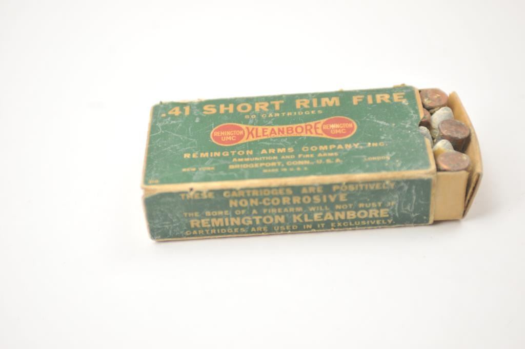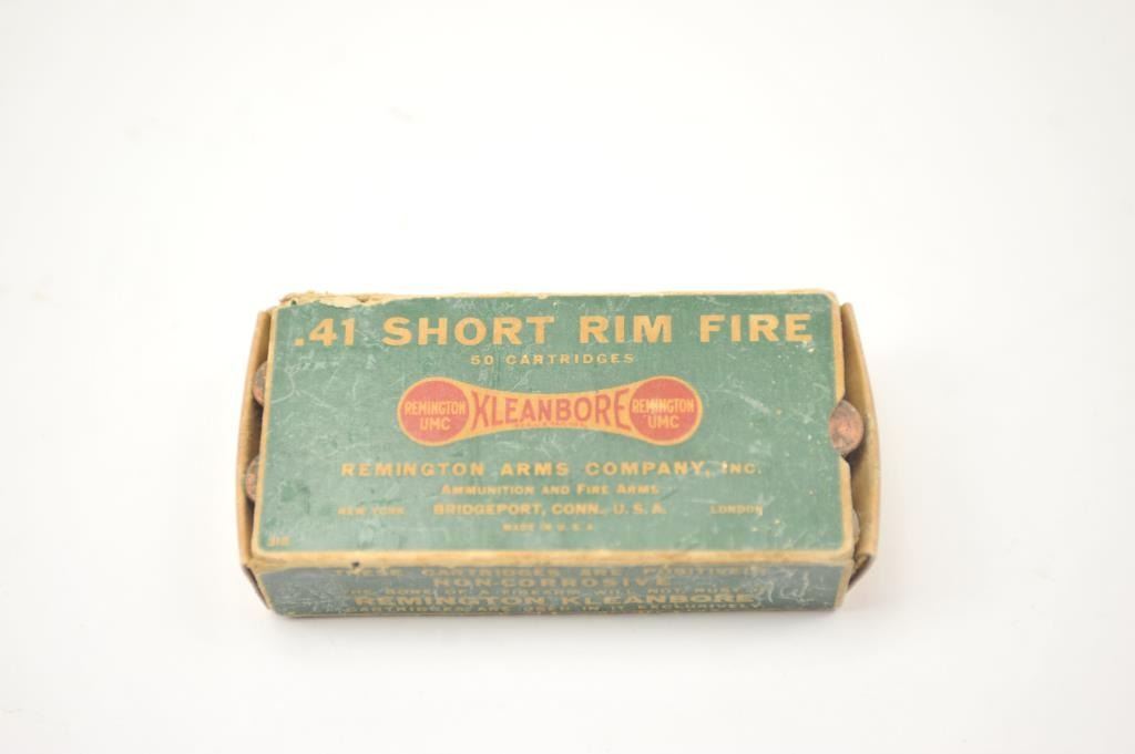 Full box of .41 Short rimfire cartridges for derringers. The UMC “Dog bone” box is opened and full with matching head stamps in good to very good condition showing natural aging to lead and cases, circa 1900-1930. Aperfect item for a Remington display. Est.: $175-$350.