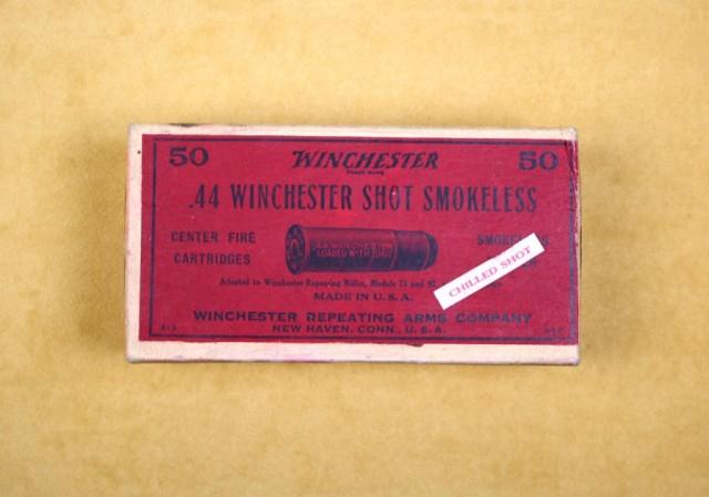 Full open box of .44 Winchester shot cartridges, showing red and purple labels, fine to excellent label, type used with Winchester 73’s and in Wild West shows. Est: $300 - $600