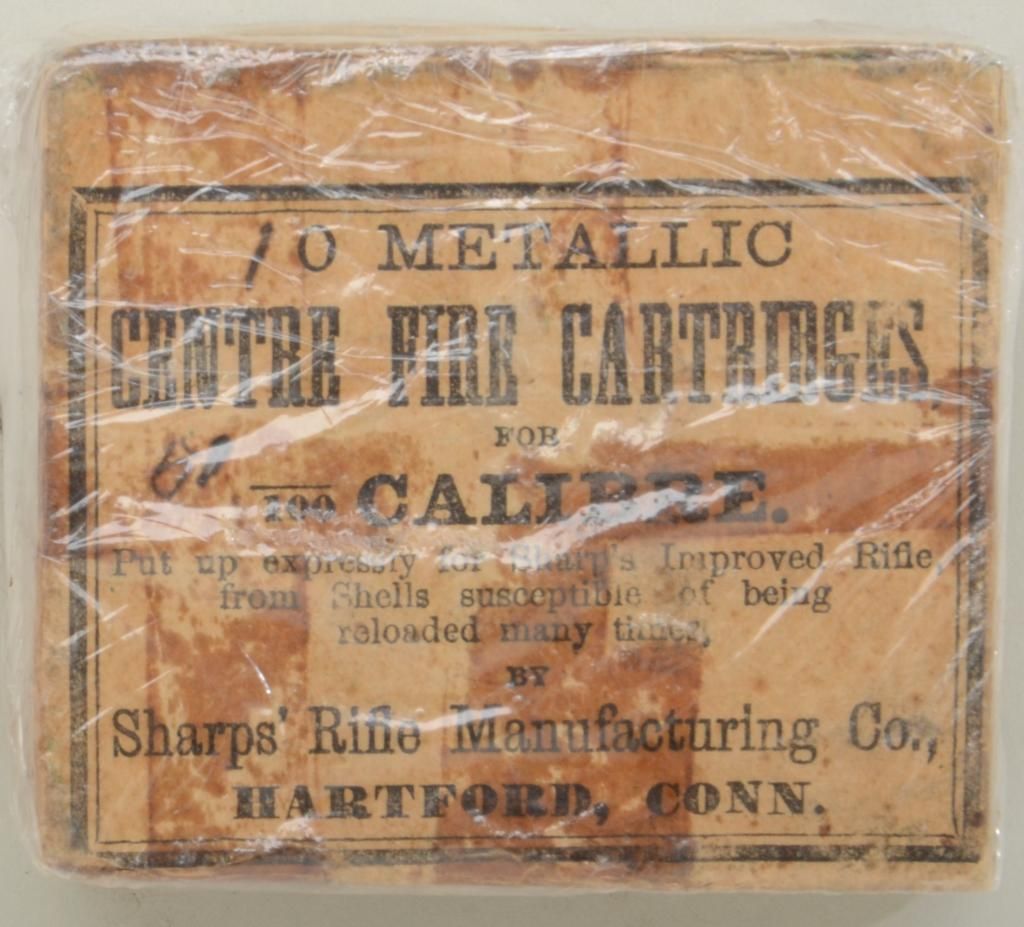 Full open box of cartridges for .50-100 cal. Sharps by Sharps Manufacturing Company, Hartford, CT; opened but full, stamped label on each end, fully legible with penned caliber and cartridge count (10). The boxshows some staining, small tatters but is at least very good, the cartridges are matching headstamps. Hard to find .50 cal Sharps ammo by Sharps themselves. Est.: $500-$1,000