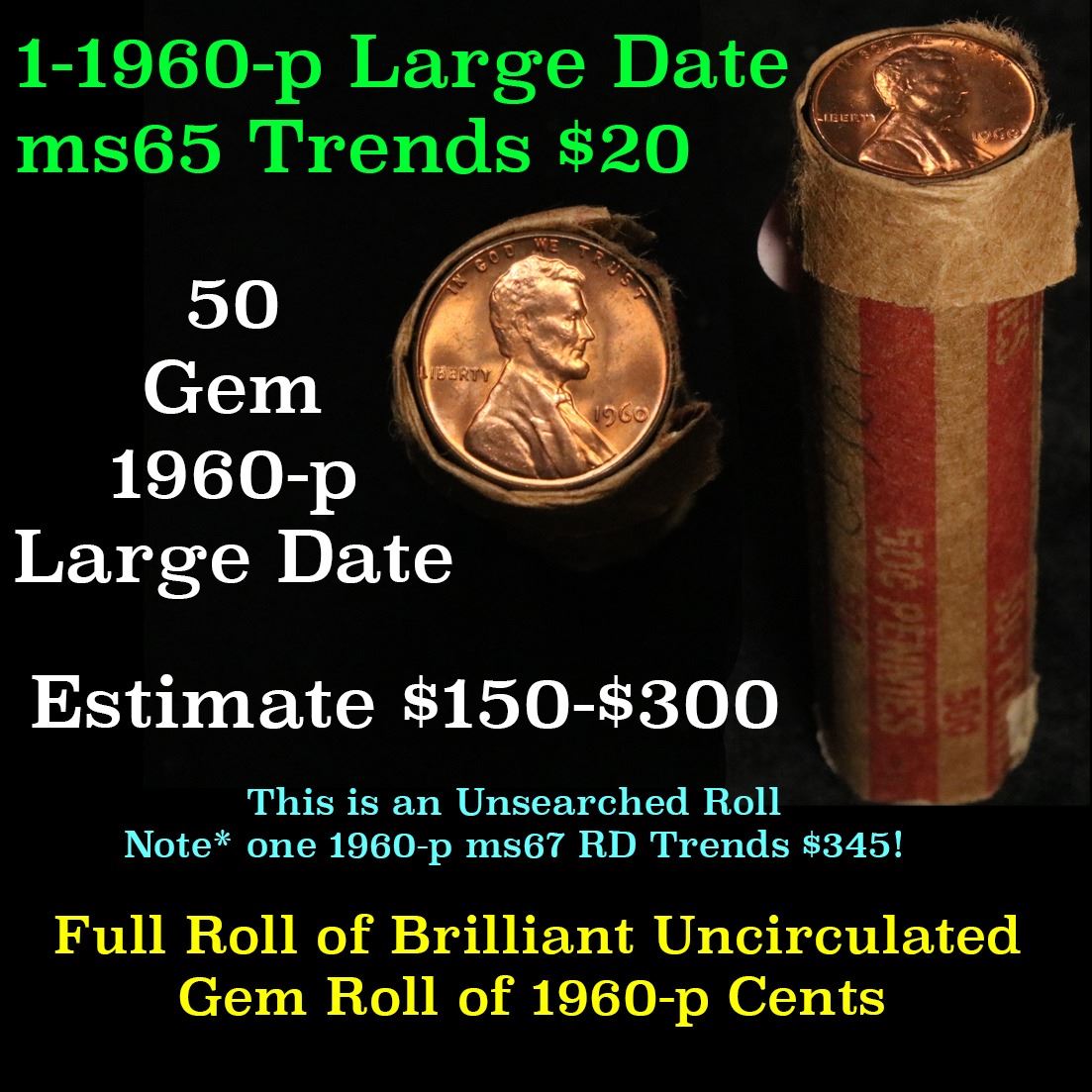 Full original shotgun roll of 1960-p Large Date Lincoln Cents 1c Uncirculated Condition . .. A real find. A great roll of brilliant uncirculated red lincoln cents. All 1960 Large Dates. Trends lists ms64rd at $15/each, $500