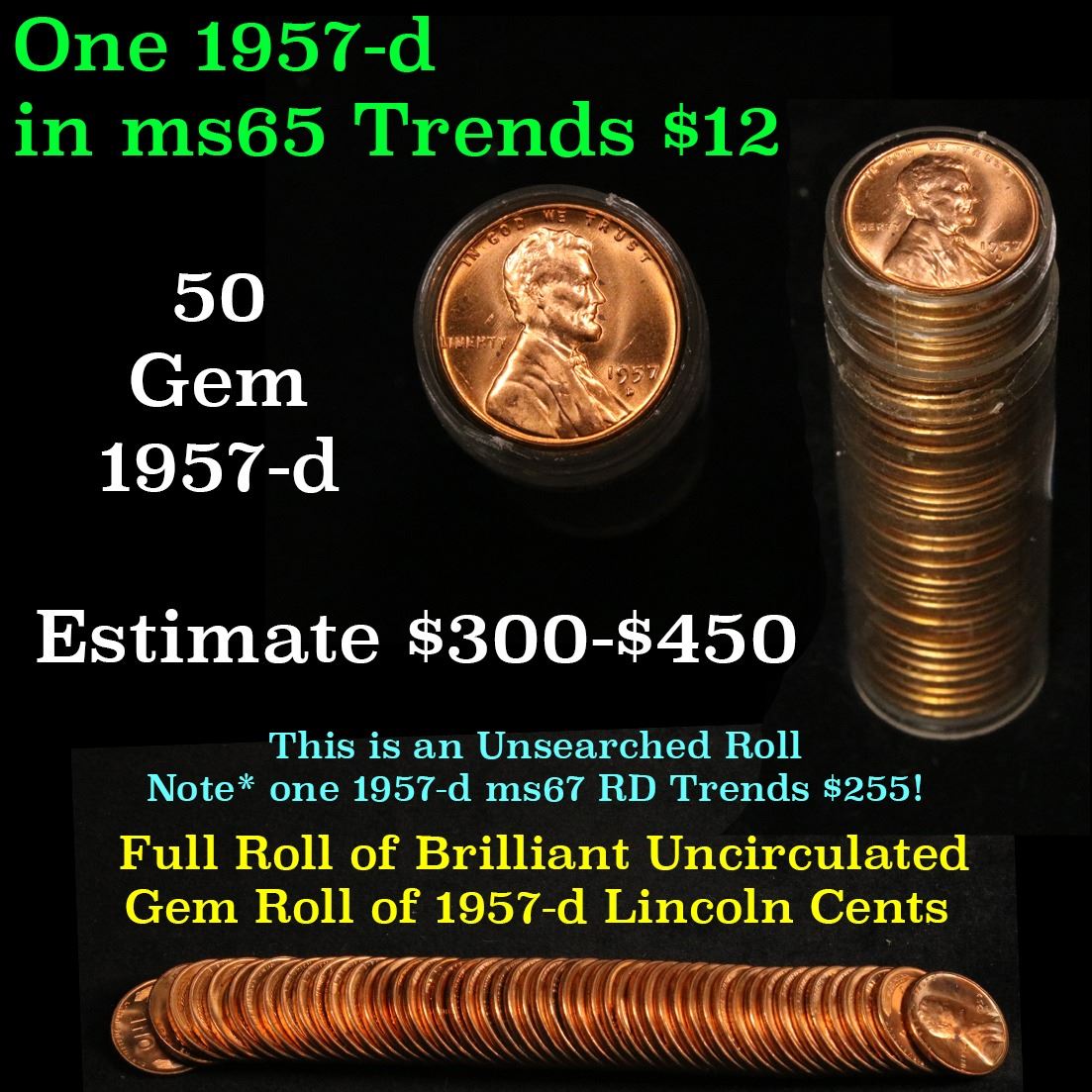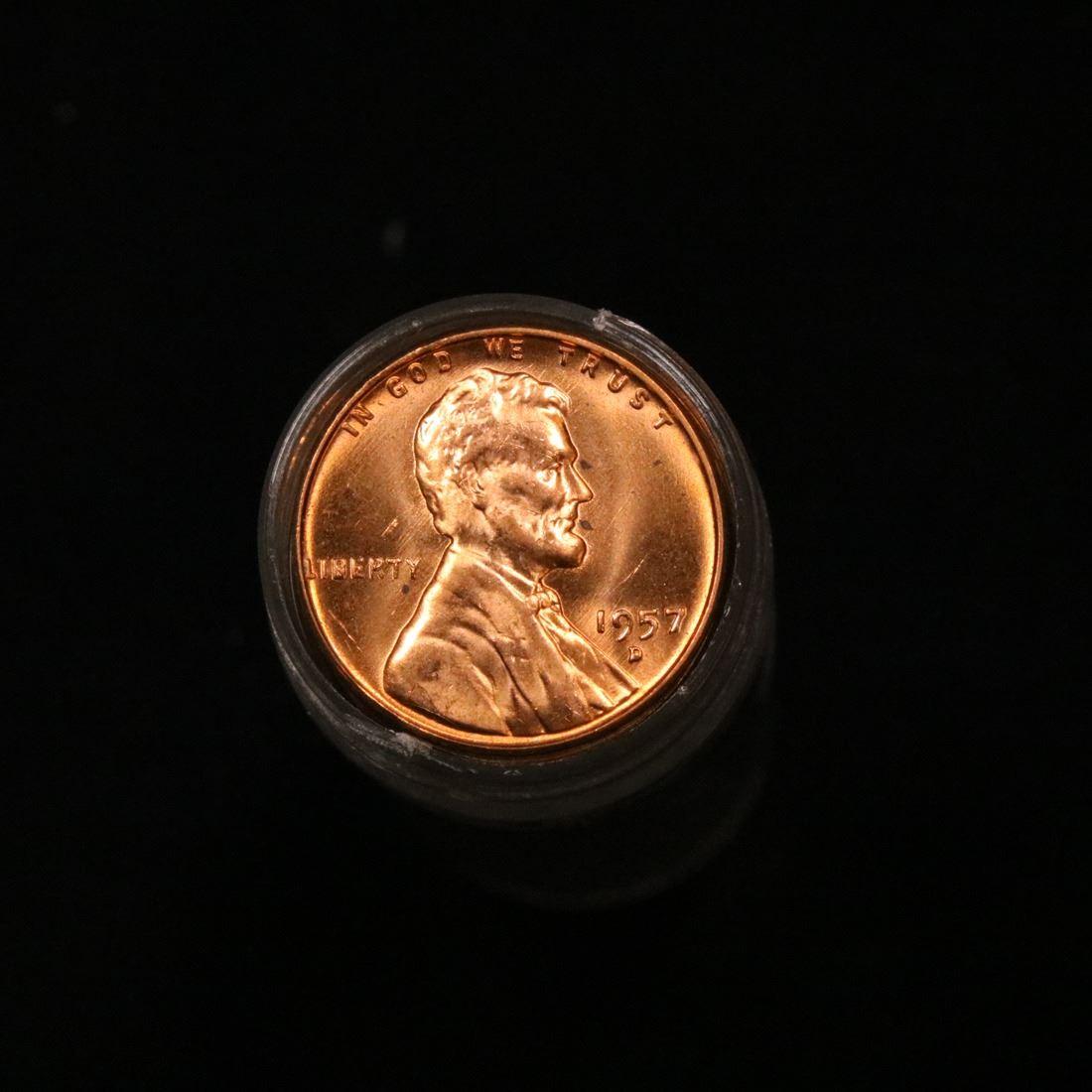 Full roll of 1957-d Lincoln Cents 1c Uncirculated Condition . .. A real find. A great roll of brilliant uncirculated red lincoln cents. All 1957-d Trends lists ms63rd at $9/each, $360
