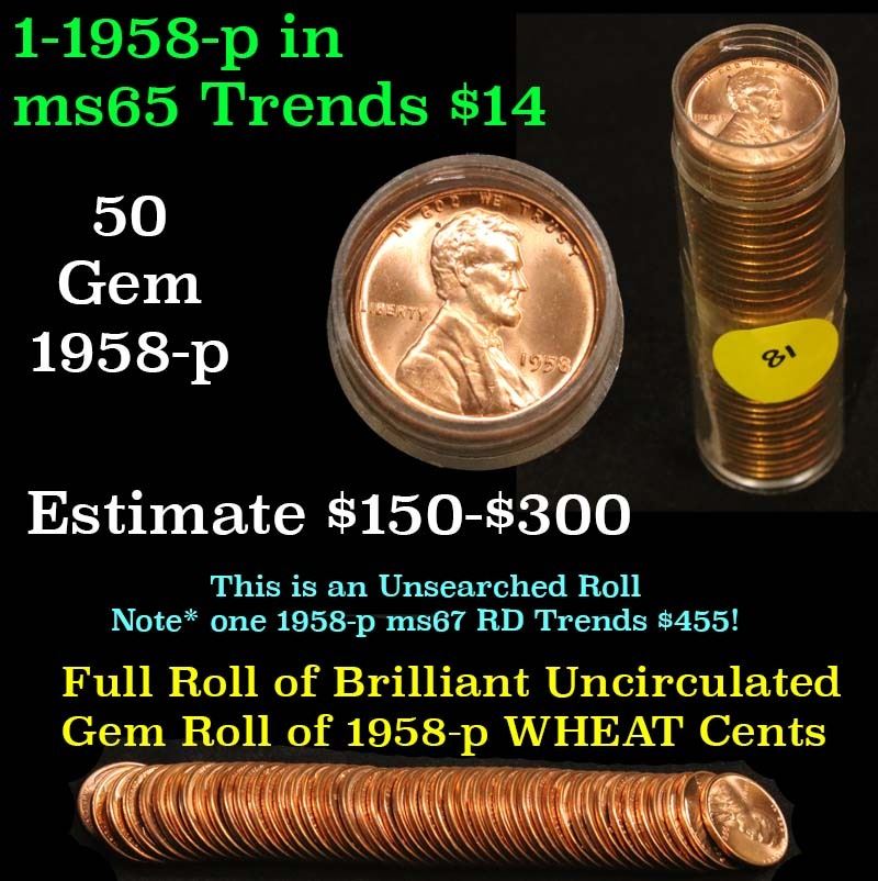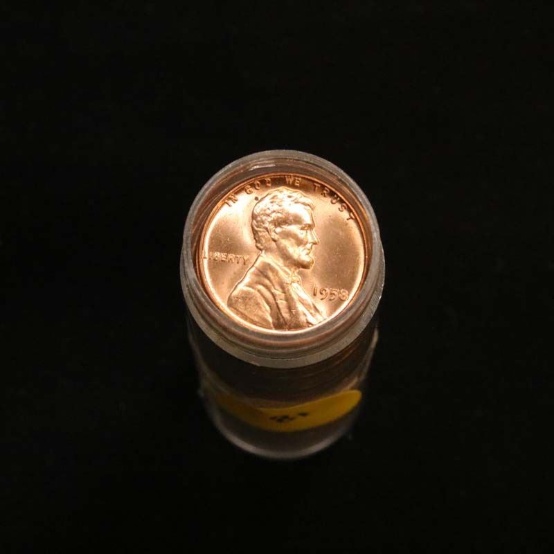 Full roll of 1958-p Lincoln Cents 1c Uncirculated Condition . .. A great BU roll of 1958-p lincoln cents. Nice red unc roll. Trends lists ms64rd at $10/each, $500