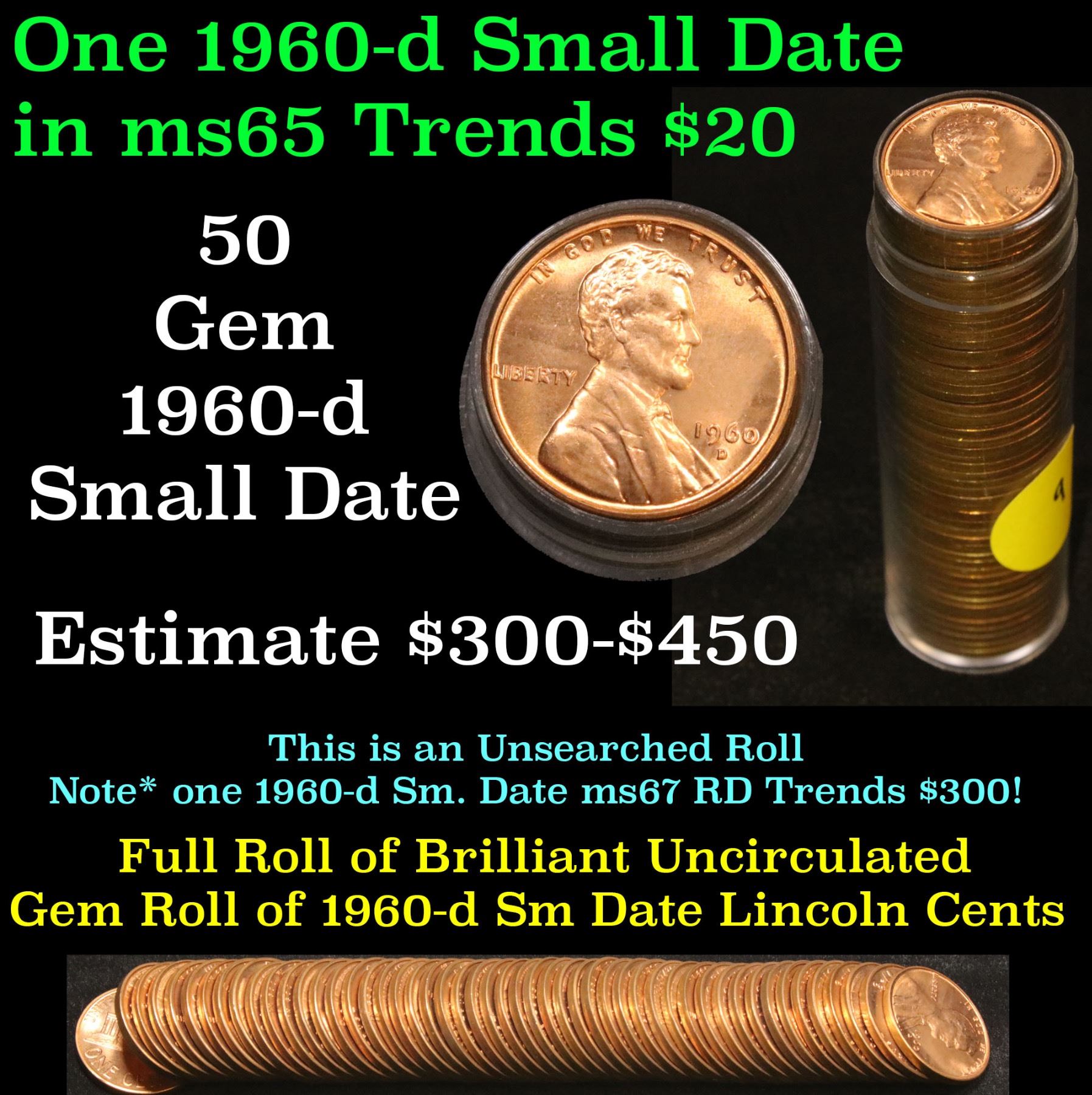 Full roll of 1960-d Small Date Lincoln Cents 1c Uncirculated Condition. A real find. A great roll of brilliant uncirculated red lincoln cents. All 1960-d Small Dates. Trends lists ms63rd at $10/each, $400