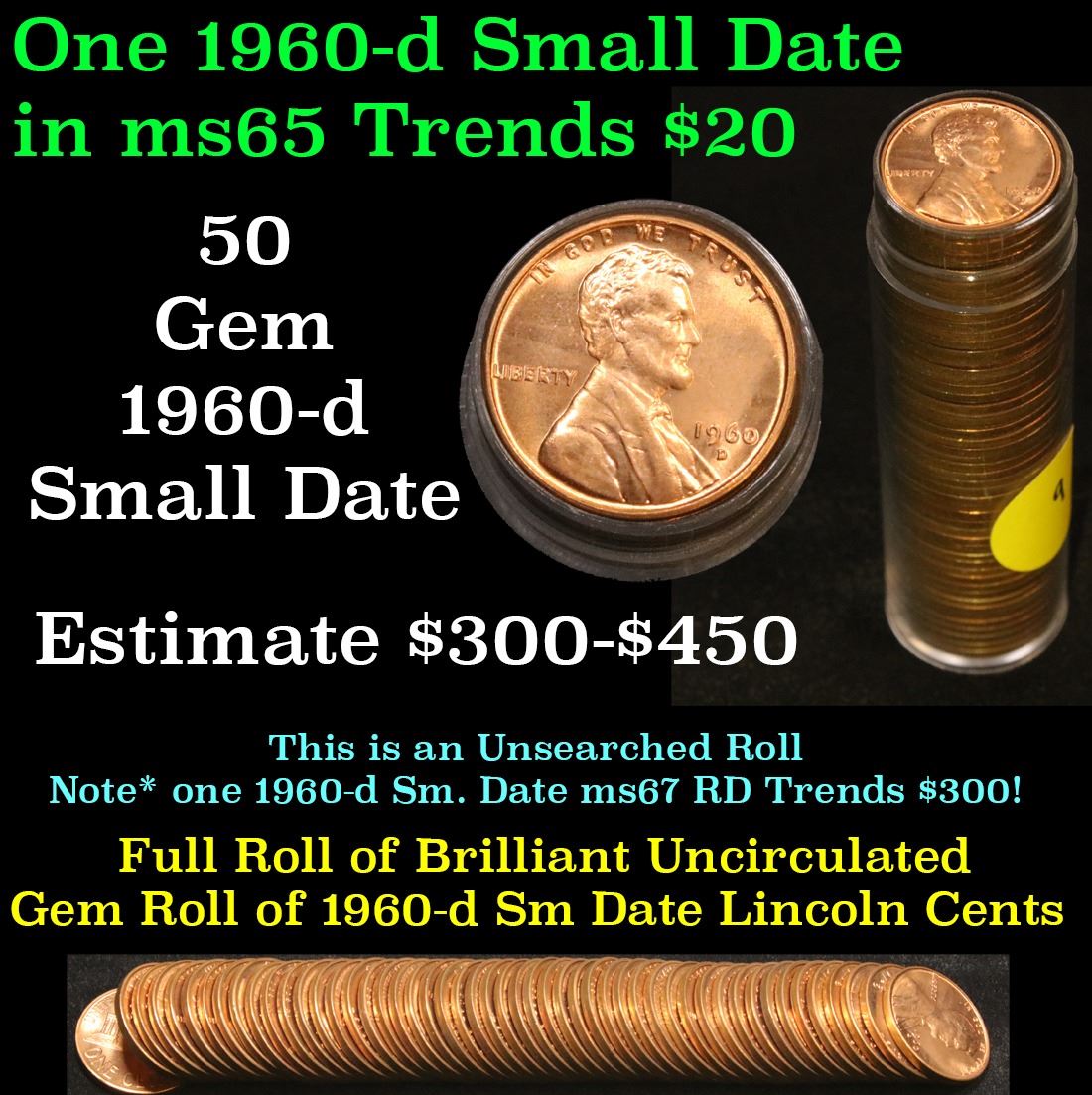 Full roll of 1960-d Small date Lincoln Cents 1c Uncirculated Condition . .. A real find. A great roll of brilliant uncirculated red lincoln cents. All 1960-d Small Date. Trends lists ms64rd at $12.50, $500