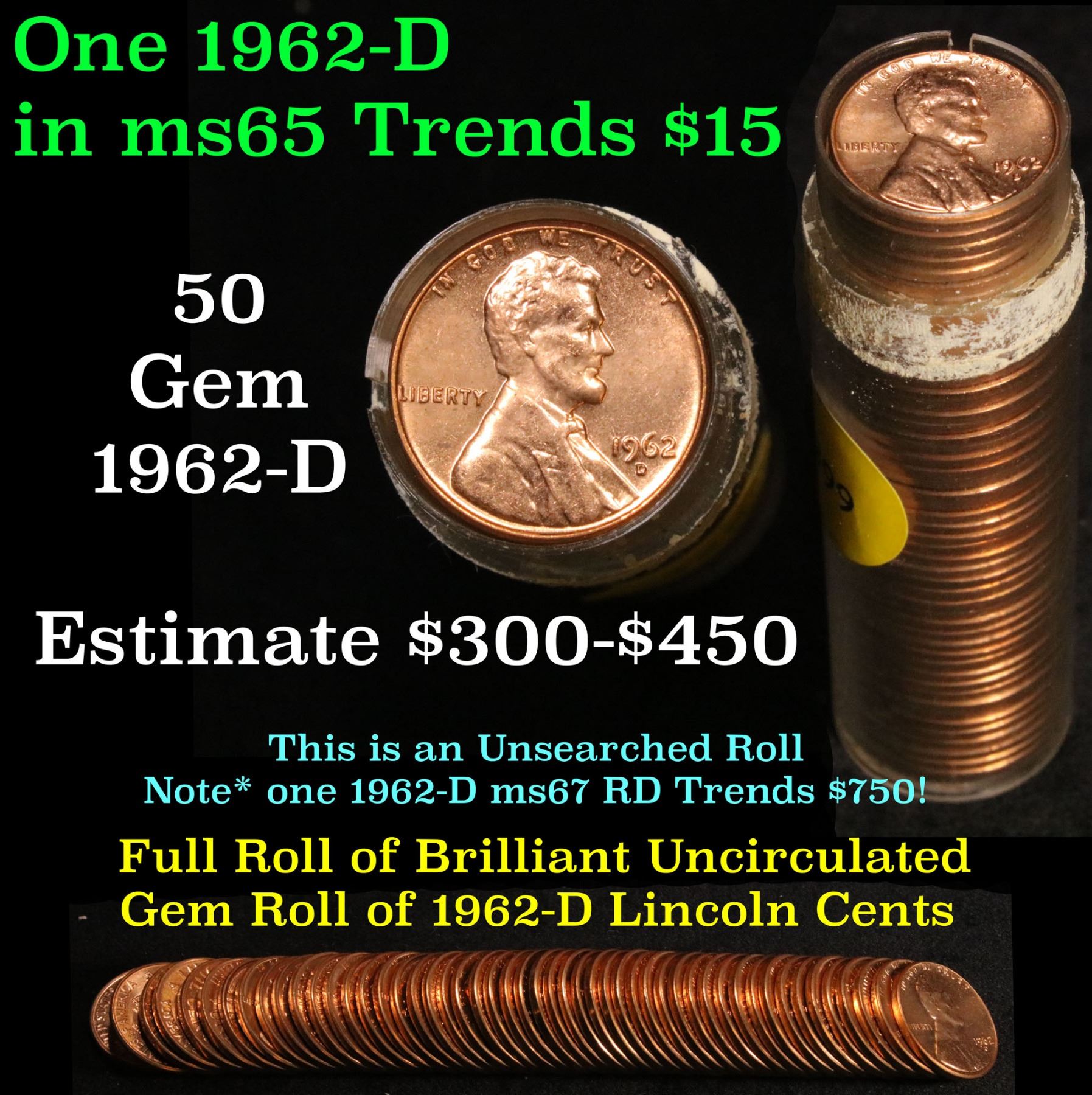 Full roll of 1962-d Lincoln Cents 1c Uncirculated Condition. A real find. A great roll of brilliant uncirculated red lincoln cents. All 1962-d. Trends lists ms64rd at $10, $400
