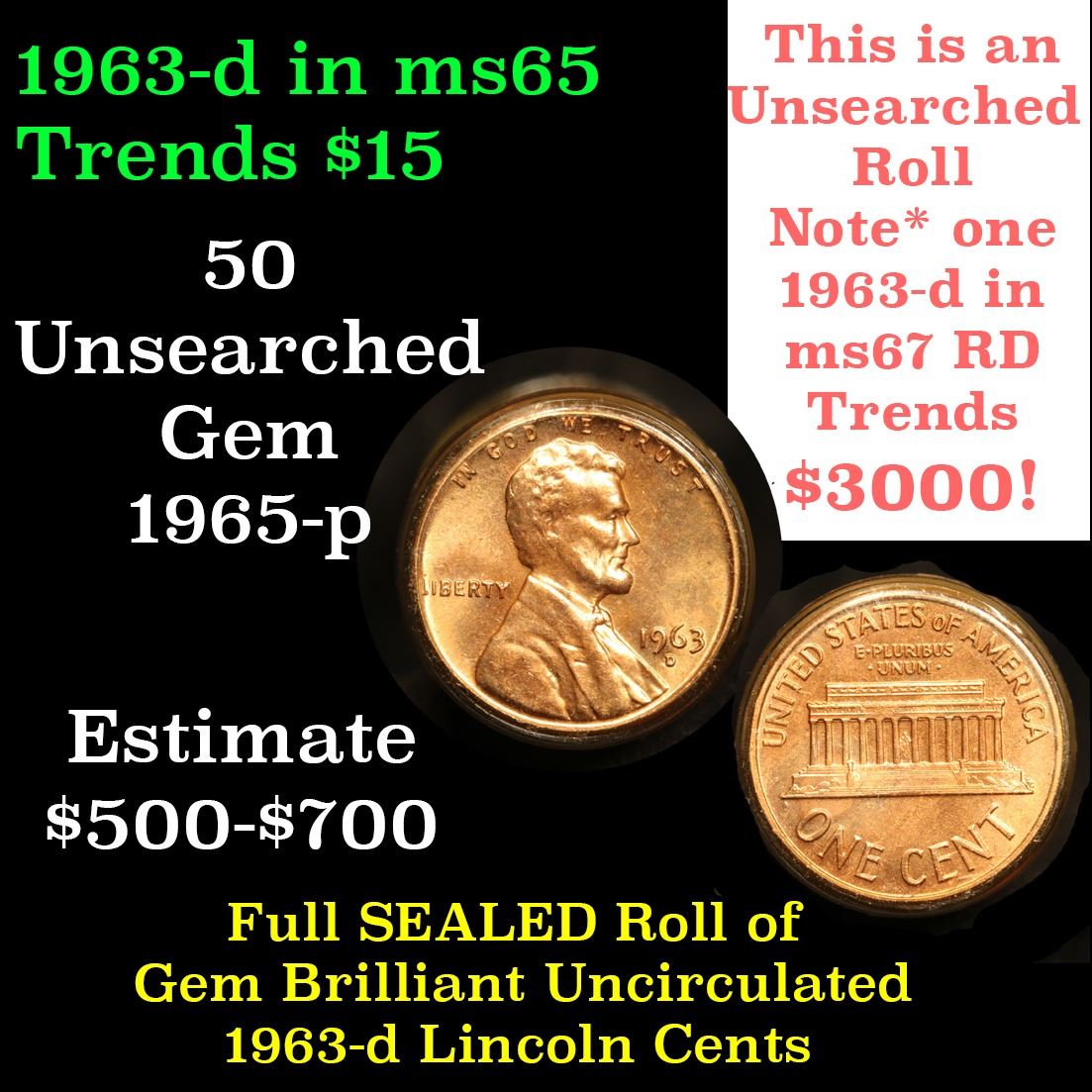 Full roll of 1963-d Lincoln Cents 1c Uncirculated Condition . .. A real find. A great roll of brilliant uncirculated red lincoln cents. All 1963-d. Trends lists ms64rd at $12.50, $500