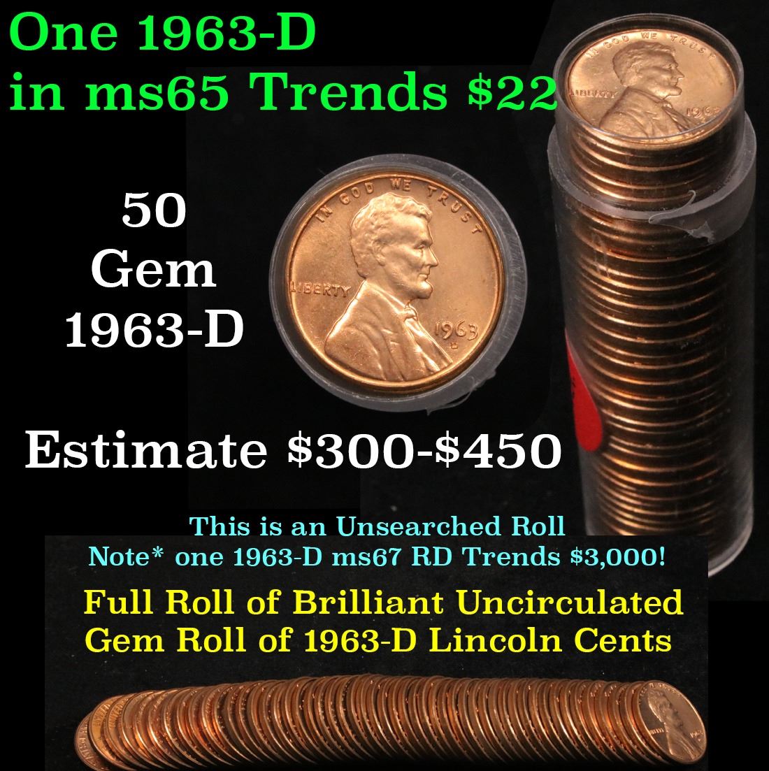 Full roll of 1963-d Lincoln Cents 1c Uncirculated Condition . .. A real find. A great roll of brilliant uncirculated red lincoln cents. All 1963-d. Trends lists ms64rd at $10/each, $400