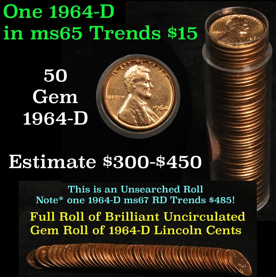 Full roll of 1964-d Lincoln Cents 1c Uncirculated Condition . .. A real find. A great roll of brilliant uncirculated red lincoln cents. All 1964-d. Trends lists ms64rd at $10/each, $400