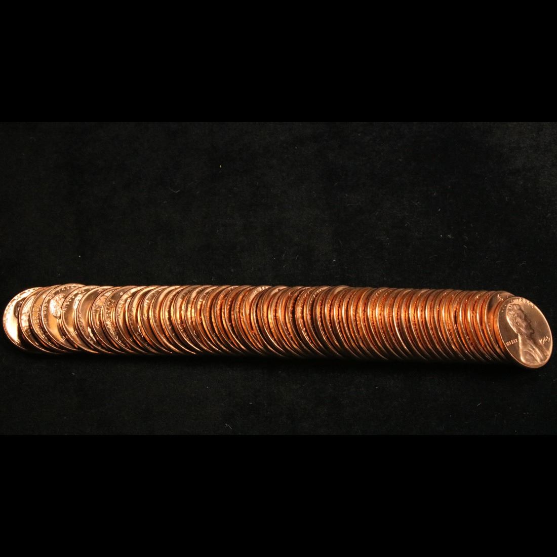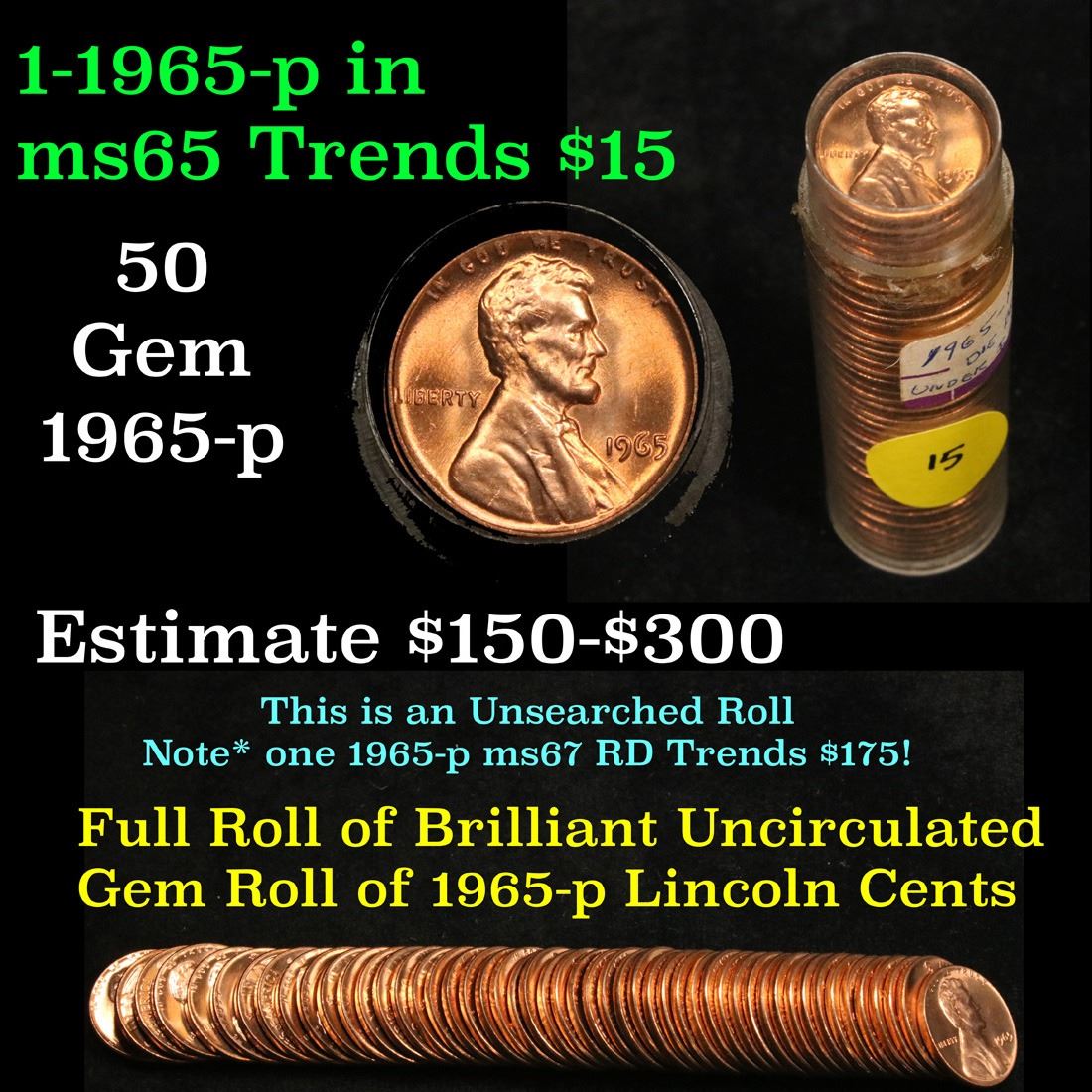 Full roll of 1965-p Lincoln Cents 1c Uncirculated Condition . .. A real find. A great roll of brilliant uncirculated red lincoln cents. All 1965-p. Trends lists ms64rd at $7.50/each, $300