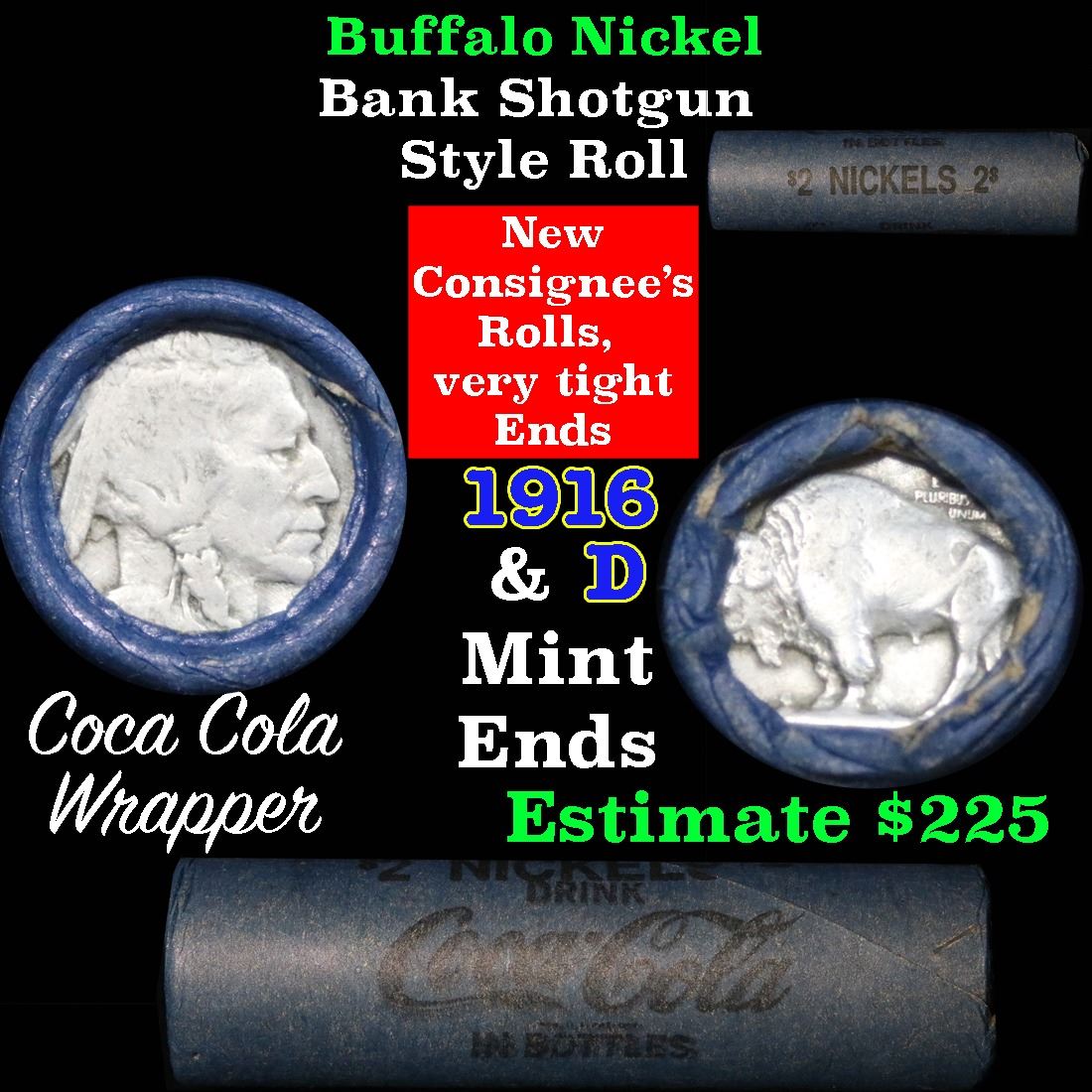 Full roll of Buffalo Nickels, 1916 on one end & a 'd' Mint reverse on other end. The roll is held in an old, rare and collectible Coca-Cola wrapper. These shotgun rolls are all from a new consignee. They are all frrom one Estate. The ends on these rolls are very tight. This particular Roll shows a 1916 on one end & a ''d' Denver Mint reverse on the other end. We will guarantee they are all full dates. The feedback on these rolls has been very positive. All full dates, many mint marks and some better dates being found.