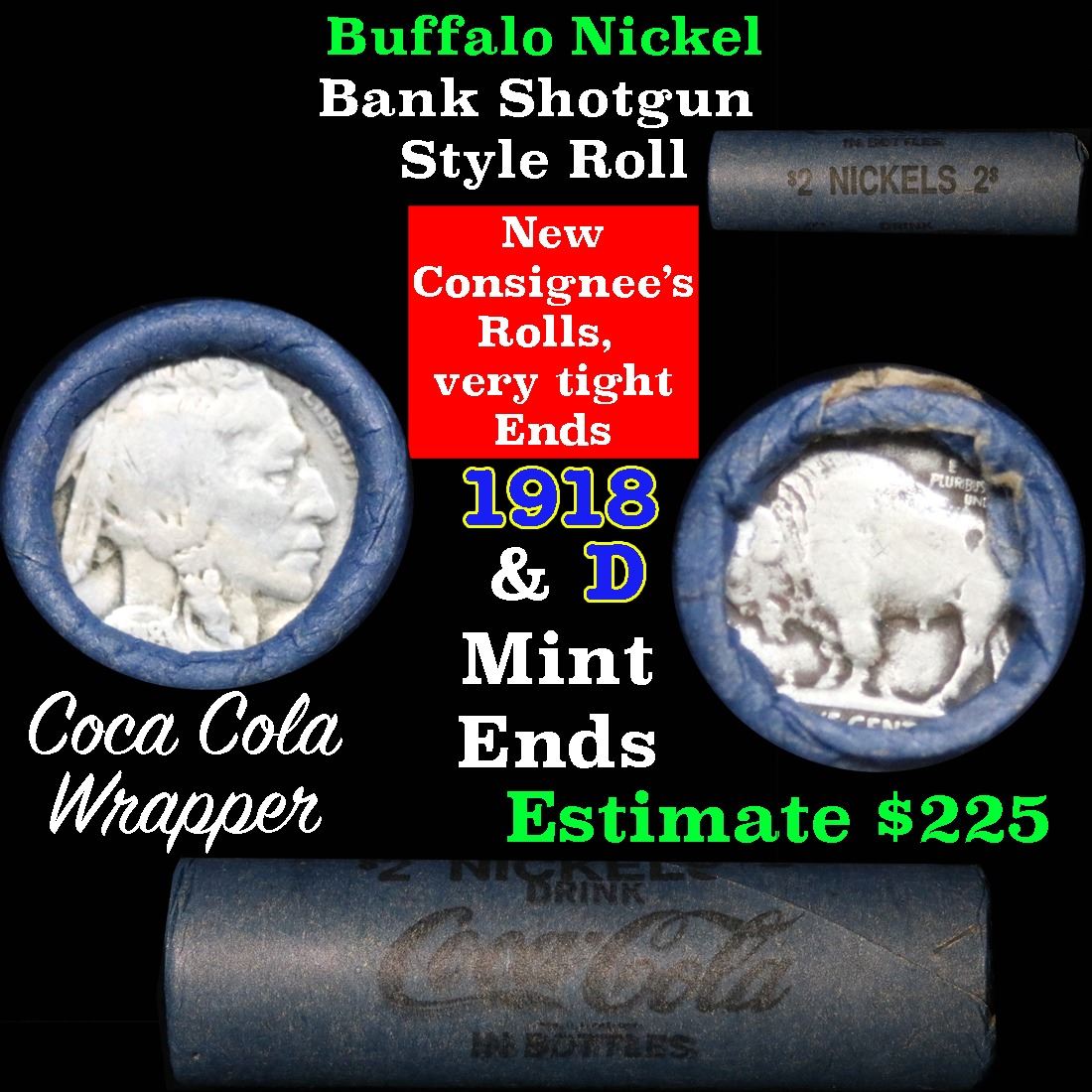 Full roll of Buffalo Nickels, 1918 on one end & a 'd' Mint reverse on other end. The roll is held in an old, rare and collectible Coca-Cola wrapper. These shotgun rolls are all from a new consignee. They are all frrom one Estate. The ends on these rolls are very tight. This particular Roll shows a 1918 on one end & a ''d' Denver Mint reverse on the other end. We will guarantee they are all full dates. The feedback on these rolls has been very positive. All full dates, many mint marks and some better dates being found.