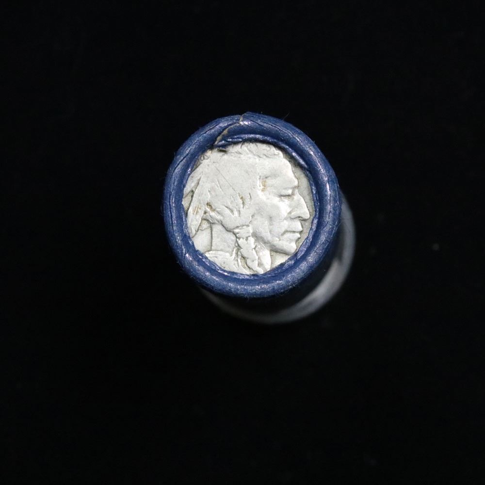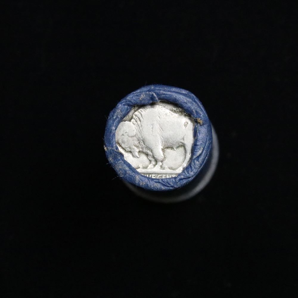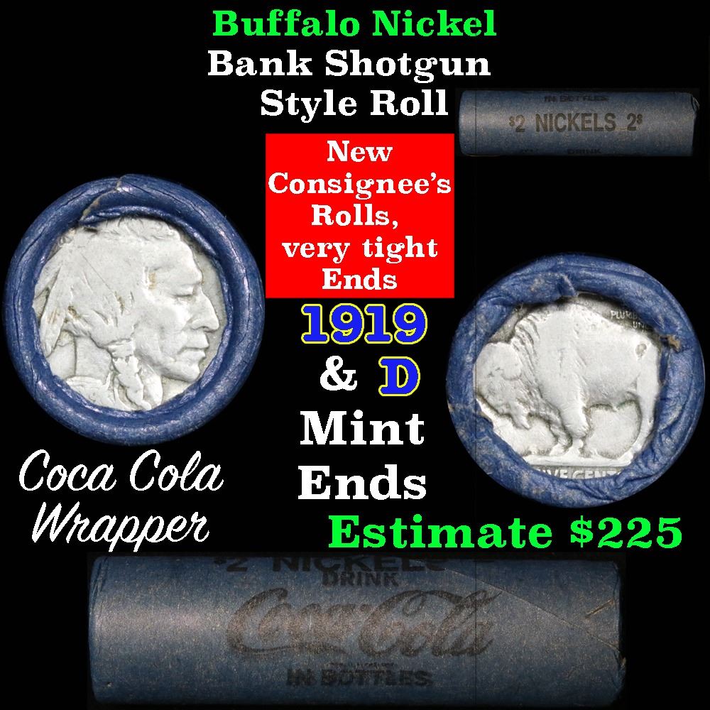 Full roll of Buffalo Nickels, 1919 on one end & a 'd' Mint reverse on other end. The roll is held in an old, rare and collectible Coca-Cola wrapper. These shotgun rolls are all from a new consignee. They are all frrom one Estate. The ends on these rolls are very tight. This particular Roll shows a 1919 on one end & a ''d' Denver Mint reverse on the other end. We will guarantee they are all full dates. The feedback on these rolls has been very positive. All full dates, many mint marks and some better dates being found.
