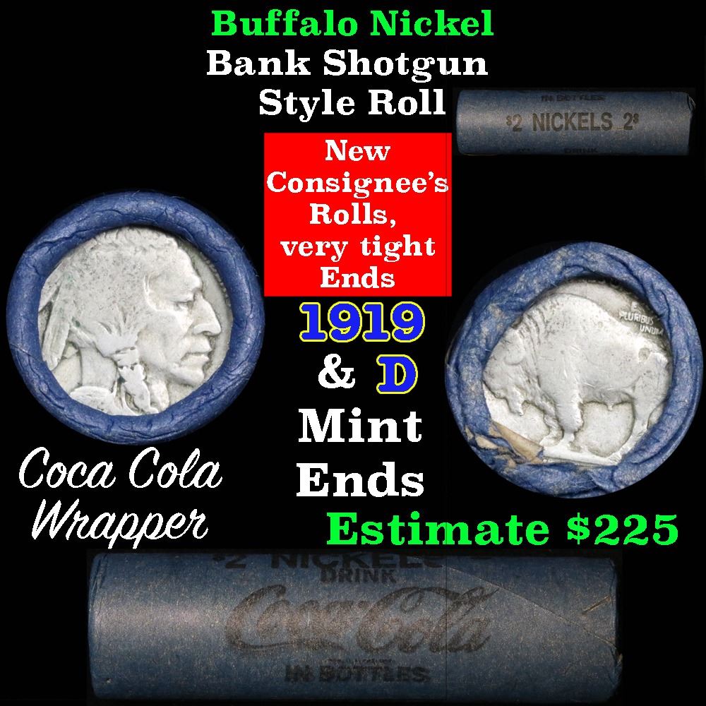 Full roll of Buffalo Nickels, 1919 on one end & a 'd' Mint reverse on other end. The roll is held in an old, rare and collectible Coca-Cola wrapper. These shotgun rolls are all from a new consignee. They are all frrom one Estate. The ends on these rolls are very tight. This particular Roll shows a 1919 on one end & a ''d' Denver Mint reverse on the other end. We will guarantee they are all full dates. The feedback on these rolls has been very positive. All full dates, many mint marks and some better dates being found.