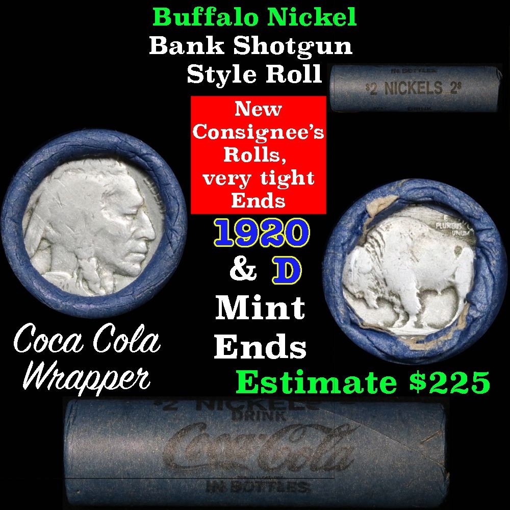 Full roll of Buffalo Nickels, 1920 on one end & a 'd' Mint reverse on other end. The roll is held in an old, rare and collectible Coca-Cola wrapper. These shotgun rolls are all from a new consignee. They are all frrom one Estate. The ends on these rolls are very tight. This particular Roll shows a 1920 on one end & a ''d' Denver Mint reverse on the other end. We will guarantee they are all full dates. The feedback on these rolls has been very positive. All full dates, many mint marks and some better dates being found.