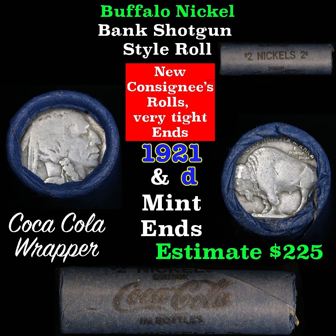Full roll of Buffalo Nickels, 1921 on one end & a 'd' Mint reverse on other end. The roll is held in an old, rare and collectible Coca-Cola wrapper. These shotgun rolls are all from a new consignee. They are all frrom one Estate. The ends on these rolls are very tight. This particular Roll shows a 1921 on one end & a ''d' Denver Mint reverse on the other end. We will guarantee they are all full dates. The feedback on these rolls has been very positive. All full dates, many mint marks and some better dates being found.