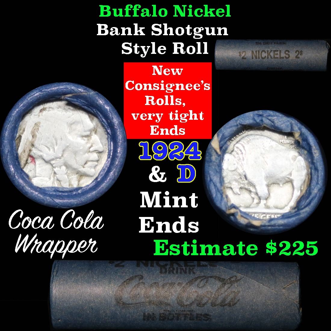Full roll of Buffalo Nickels, 1924 on one end & a 'd' Mint reverse on other end. The roll is held in an old, rare and collectible Coca-Cola wrapper. These shotgun rolls are all from a new consignee. They are all frrom one Estate. The ends on these rolls are very tight. This particular Roll shows a 1924 on one end & a ''d' Denver Mint reverse on the other end. We will guarantee they are all full dates. The feedback on these rolls has been very positive. All full dates, many mint marks and some better dates being found.