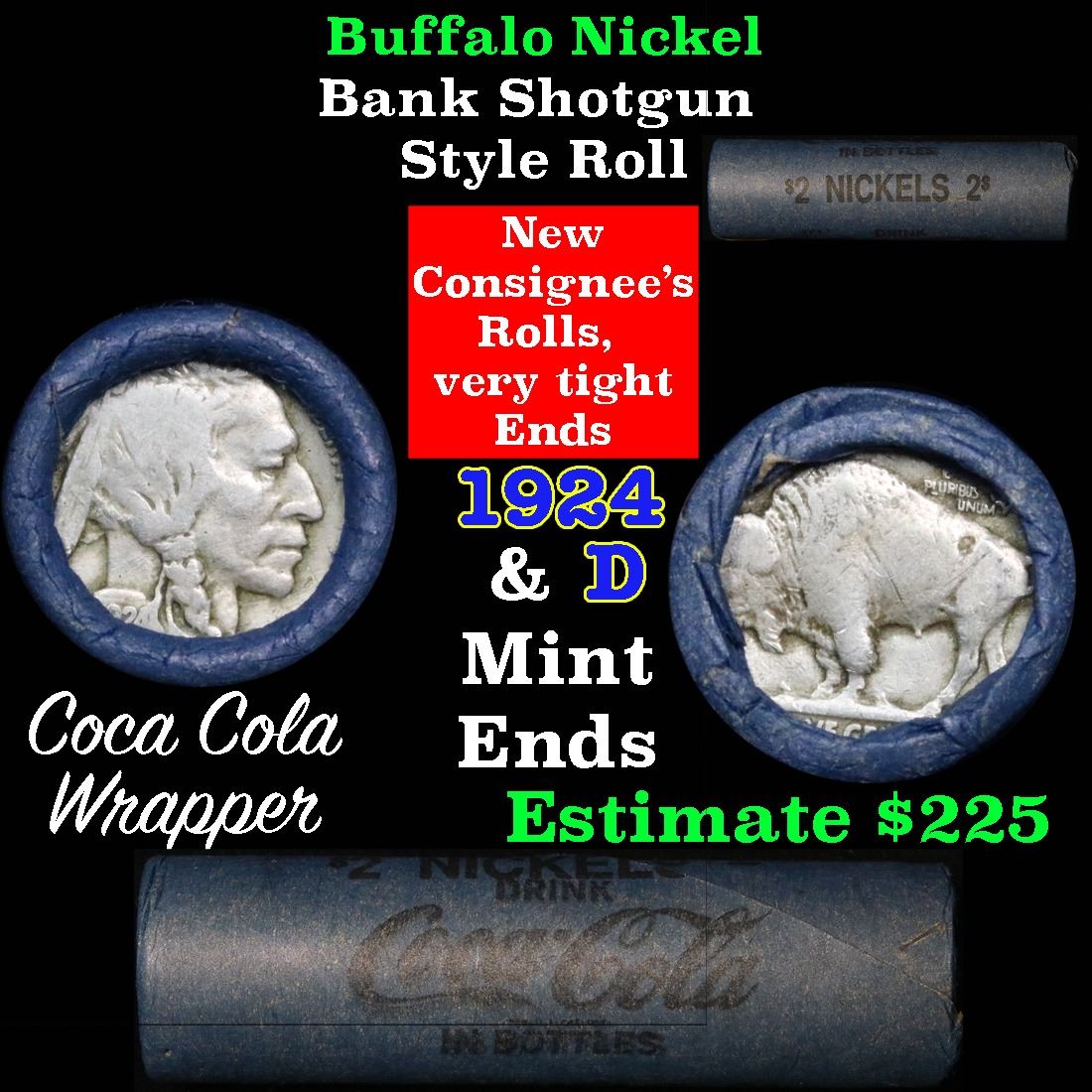 Full roll of Buffalo Nickels, 1924 on one end & a 'd' Mint reverse on other end. The roll is held in an old, rare and collectible Coca-Cola wrapper. They are all frrom one Estate. The ends on these rolls are very tight. We will guarantee they are all full dates. The feedback on these rolls has been very positive. All full dates, many mint marks and some better dates being found.