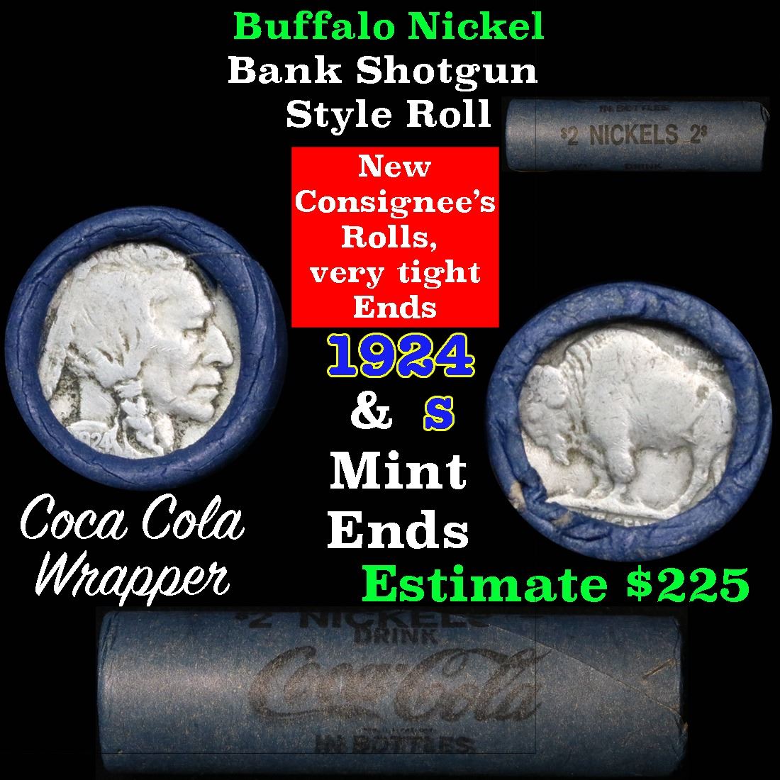 Full roll of Buffalo Nickels, 1924 on one end & a 's' Mint reverse on other end. The roll is held in an old, rare and collectible Coca-Cola wrapper. They are all frrom one Estate. The ends on these rolls are very tight. We will guarantee they are all full dates. The feedback on these rolls has been very positive. All full dates, many mint marks and some better dates being found.