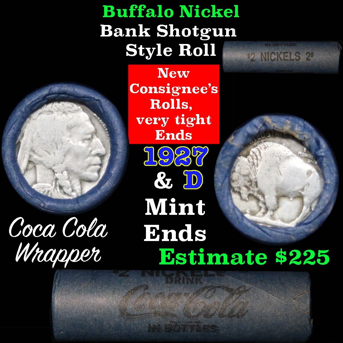 Full roll of Buffalo Nickels, 1927 on one end & a 'd' Mint reverse on other end. The roll is held in an old, rare and collectible Coca-Cola wrapper. These shotgun rolls are all from a new consignee. They are all frrom one Estate. The ends on these rolls are very tight. This particular Roll shows a 1927 on one end & a ''d' Denver Mint reverse on the other end. We will guarantee they are all full dates. The feedback on these rolls has been very positive. All full dates, many mint marks and some better dates being found.