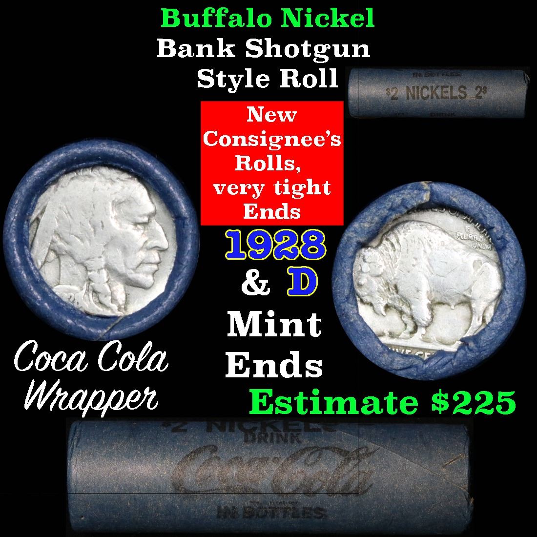 Full roll of Buffalo Nickels, 1928 on one end & a 'd' Mint reverse on other end. The roll is held in an old, rare and collectible Coca-Cola wrapper. They are all frrom one Estate. The ends on these rolls are very tight. We will guarantee they are all full dates. The feedback on these rolls has been very positive. All full dates, many mint marks and some better dates being found.