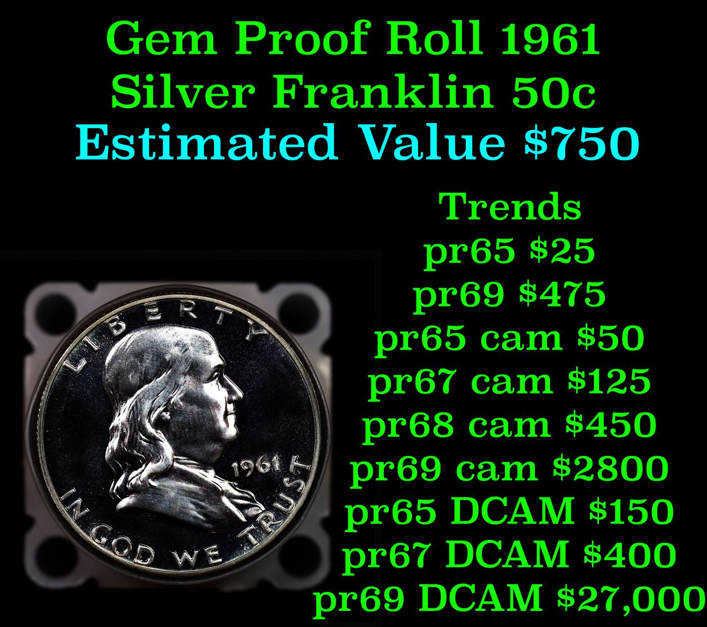 Full roll of Proof 1961 Silver Franklin 50c, 20 Coins total Franklin Half Dollar 50c. All Apper to be pr65 or higher.