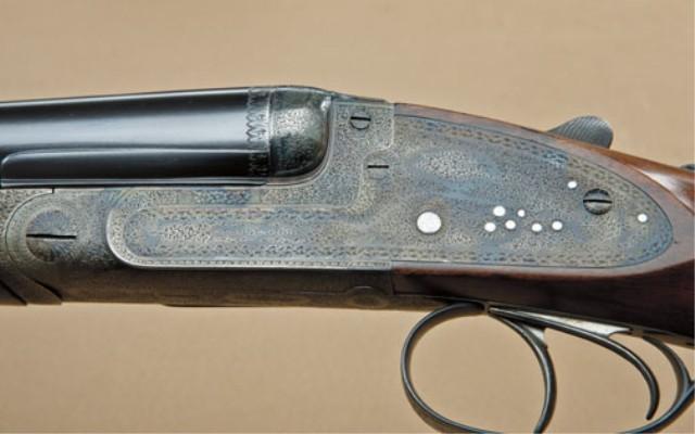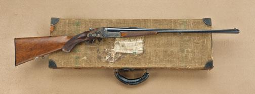 Full sidelock best-quality double rifle by George Gibbs, in original .22 Hornet caliber, 24” barrels, blue and case hardened finish, finely banknote scroll engraved, select checkered walnut stocks in trunk style case with trade label in lid. Serial #17396. The gun remains in fine to excellent condition showing 90-95% blue on barrels. 90-95% case hardening on frame, just slightly dulling on action. The stocks are fine to near excellent. Triggerguard shows 95% blue thinning on the edges. The action is tight, the bores are excellent. The rifle shows full signature on locks and shows three-leaf rear sights. The partition style case is in very good condition with some wear at contact points, small losses. The exterior of the case is fair to good with some travel wear, storage, and slight shipping damage to the outside of the case. This rifle is original in this caliber and shows British smokeless proofs marked “.22 Hornet 45 grains” beneath breech. A very rare and desirable classic double rifle that is seldom encountered in this caliber. From the Robert Petersen estate. Est: $35,000 - $70,000